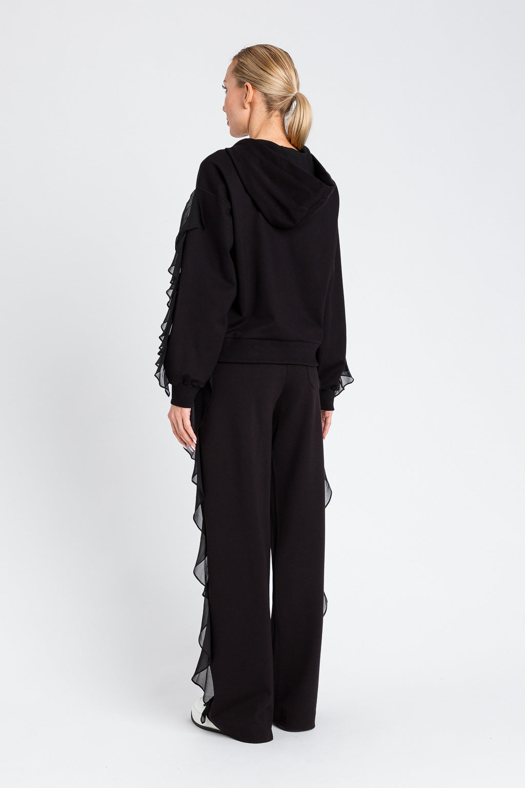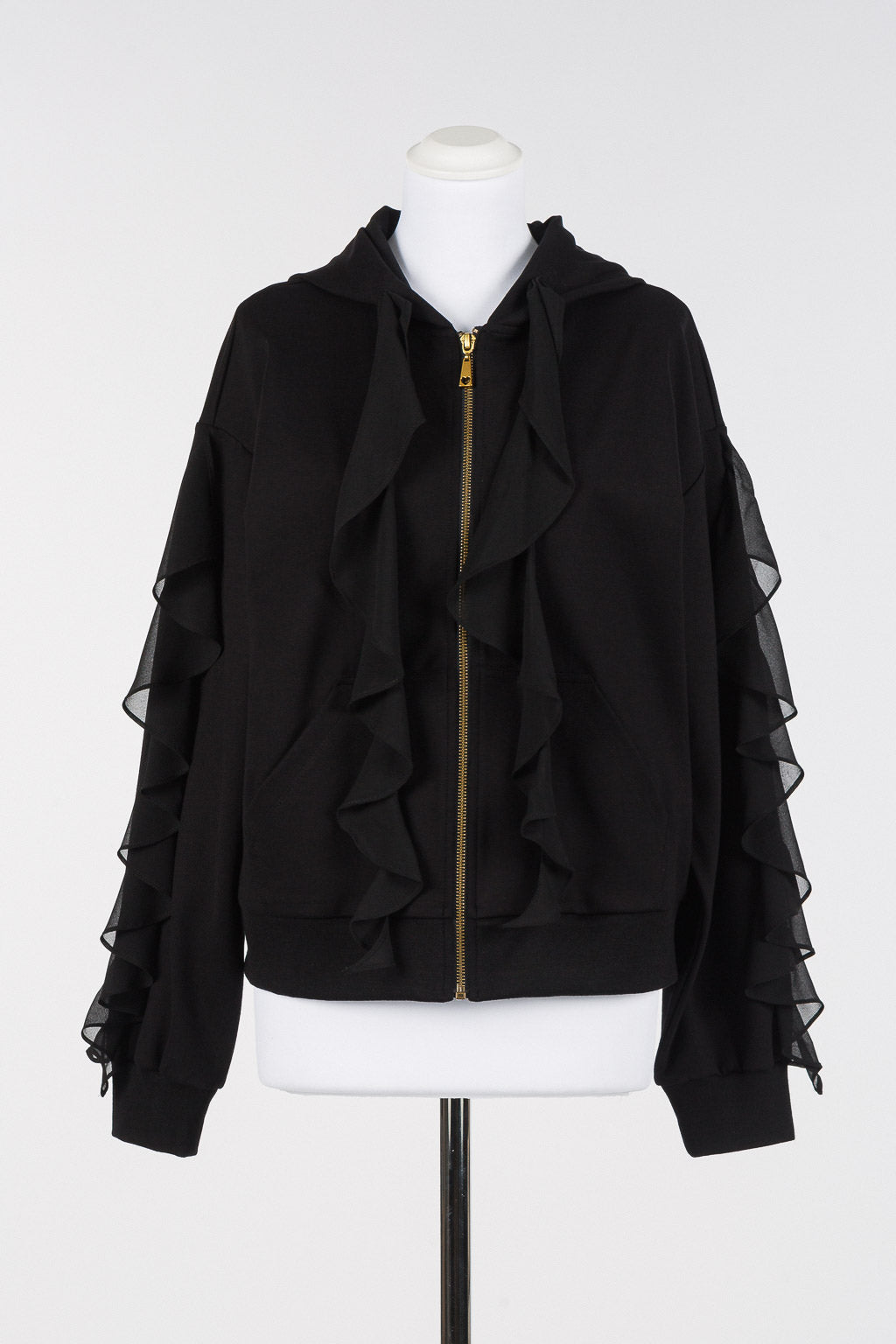 Felpa in punto Milano con volant in georgette nella coulisse al collo e sulle maniche. Ha cappuccio, chiusura con zip in metallo color ottone chiaro e tirazip logato, tasche a marsupio davanti, fondi e polsi a costine, linea morbida.