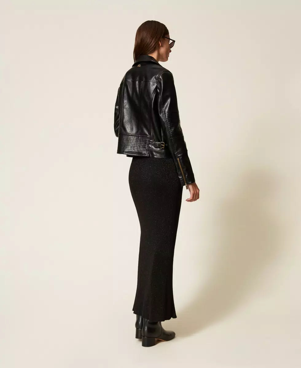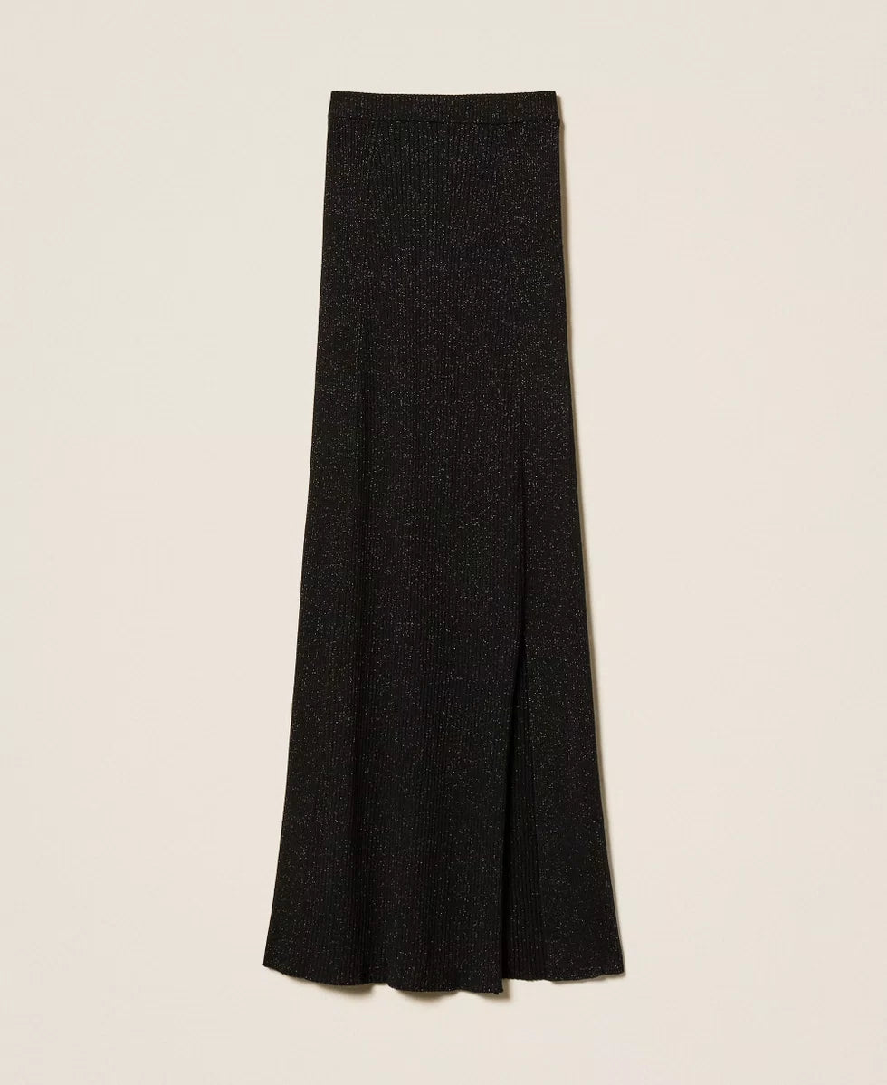 Gonna longuette in maglia con tessitura a coste in filato con lurex in tono. Ha elastico in vita, placchetta logo a cuore, linea morbida.