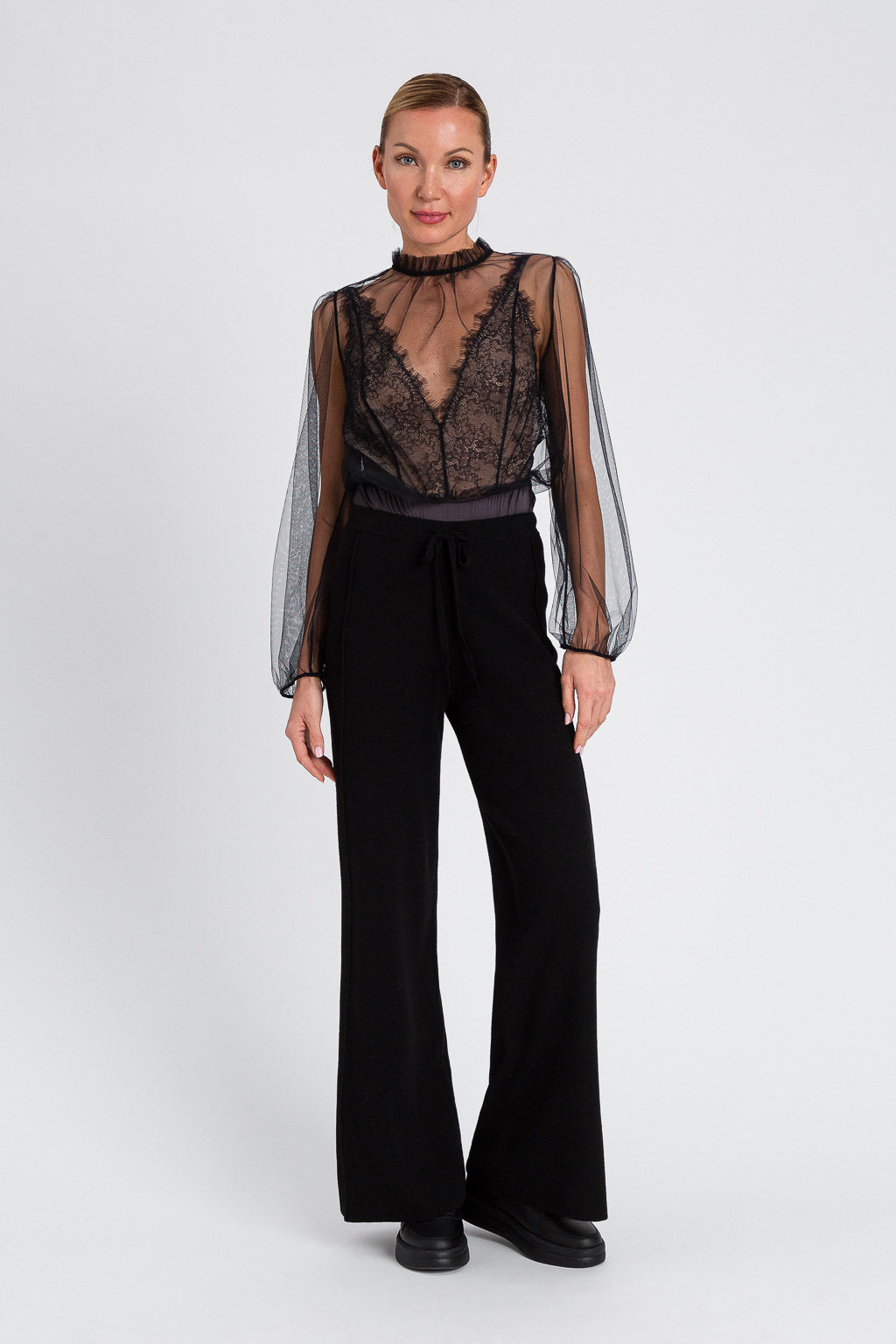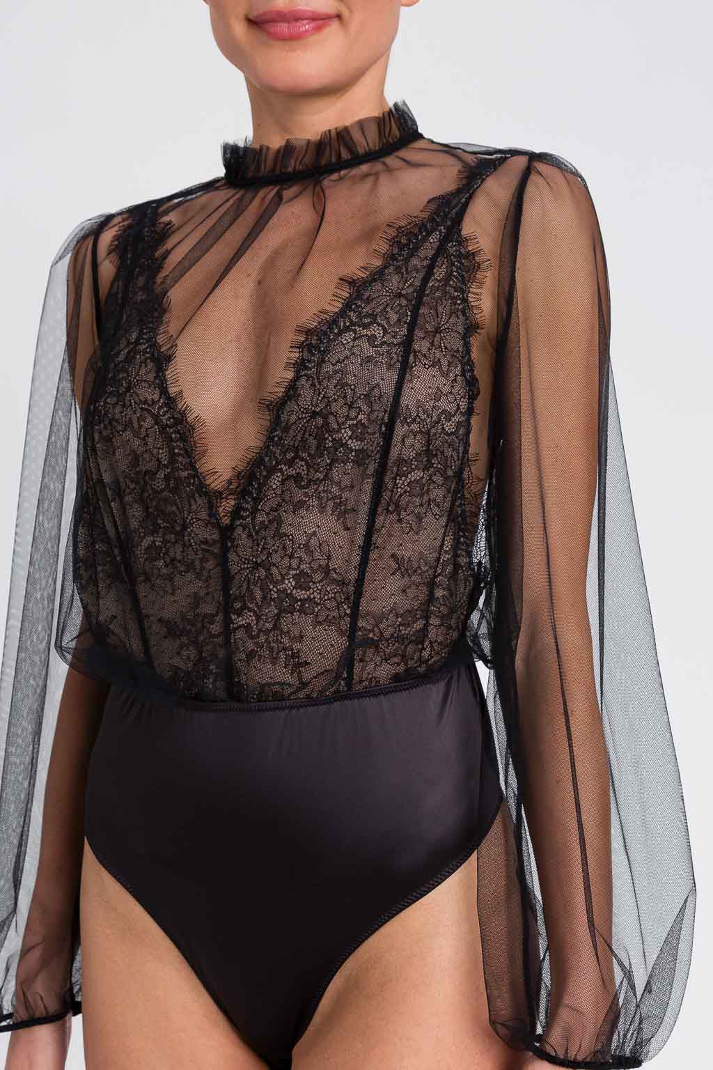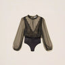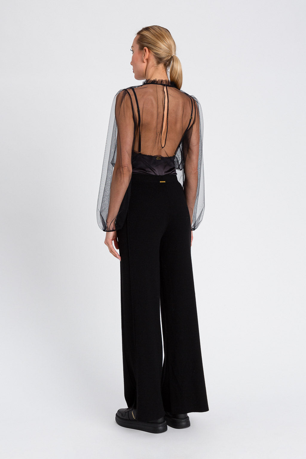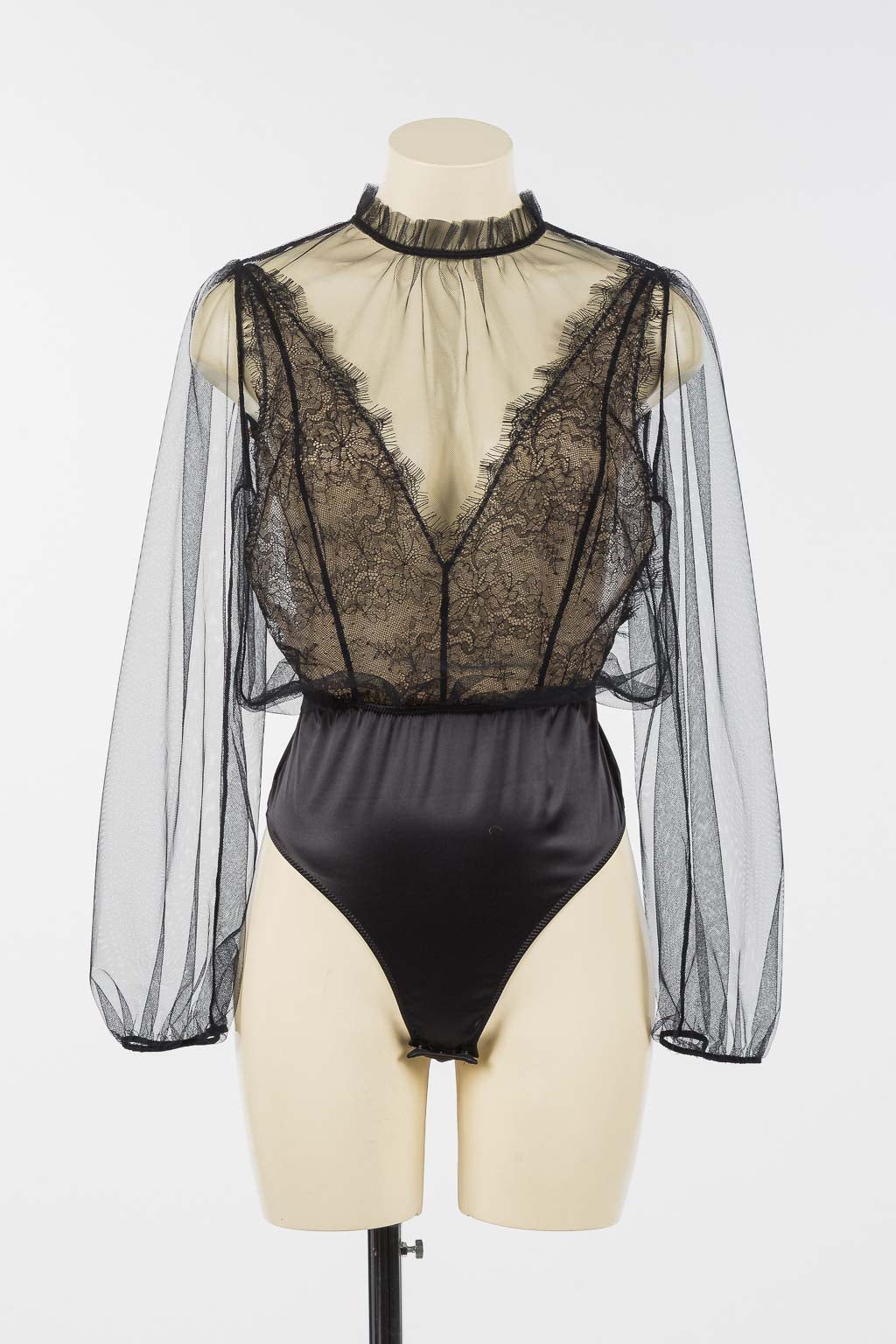 Body in tulle con inserto in pizzo smerlato in tono effetto scollatura. Ha il collo a solino, apertura a goccia con bottone ricoperto sul retro, spalle a giro leggermente a sbuffo, polsi con elastico al fondo, parte inferiore in jersey lucido, chiusura con bottoni automatici al fondo, logo Oval T in metallo sul retro.