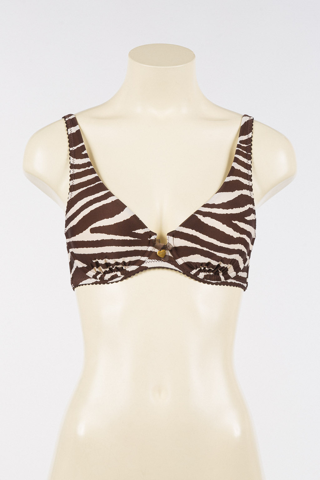 Reggiseno con ferretto in charmeuse stampata a fantasia animalier. Senza imbottitura, ha fodera in tulle a tinta unita, arricciatura alla base delle coppe per consentire una maggiore vestibilità, stecche laterali, spalline ricoperte davanti e in elastico regolabile logato sul retro, chiusura a due ganci, fiocco in organza e logo a cuore in metallo al centro delle coppe.
