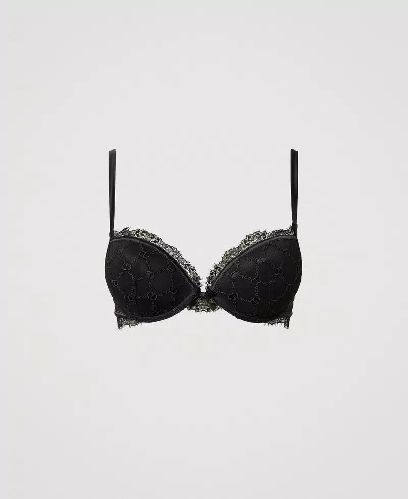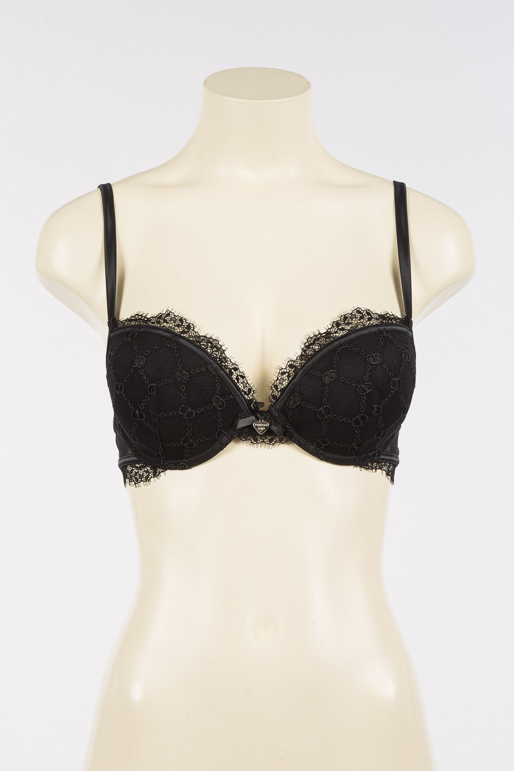 Reggiseno push-up in tulle ricamato con Oval T, pizzo smerlato e profili in raso. Ha le coppe con ferretto imbottite ed estraibili, le spalline anteriori in raso e in elastico logato dietro, la chiusura a due ganci sul retro, il logo a cuore in metallo con fiocco in raso e pizzo al centro delle coppe.