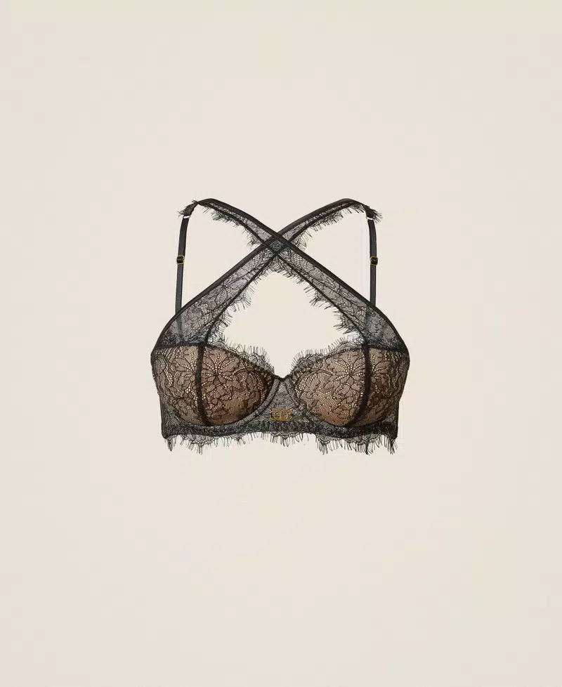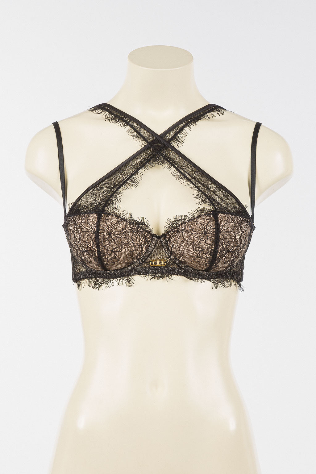 Reggiseno balconette in pizzo Chantilly smerlato con spalline in pizzo davanti e in elastico regolabile sul retro, da agganciare in modo diverso a seconda dello styling. È imbottito con coppe fisse e ha ferretto, stecche laterali, fodera a contrasto, profili in jersey lucido, retro in tulle, chiusura a due ganci dietro, placchetta logo Oval T in metallo al centro delle coppe. Spalline elastiche rimovibili in dotazione.