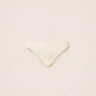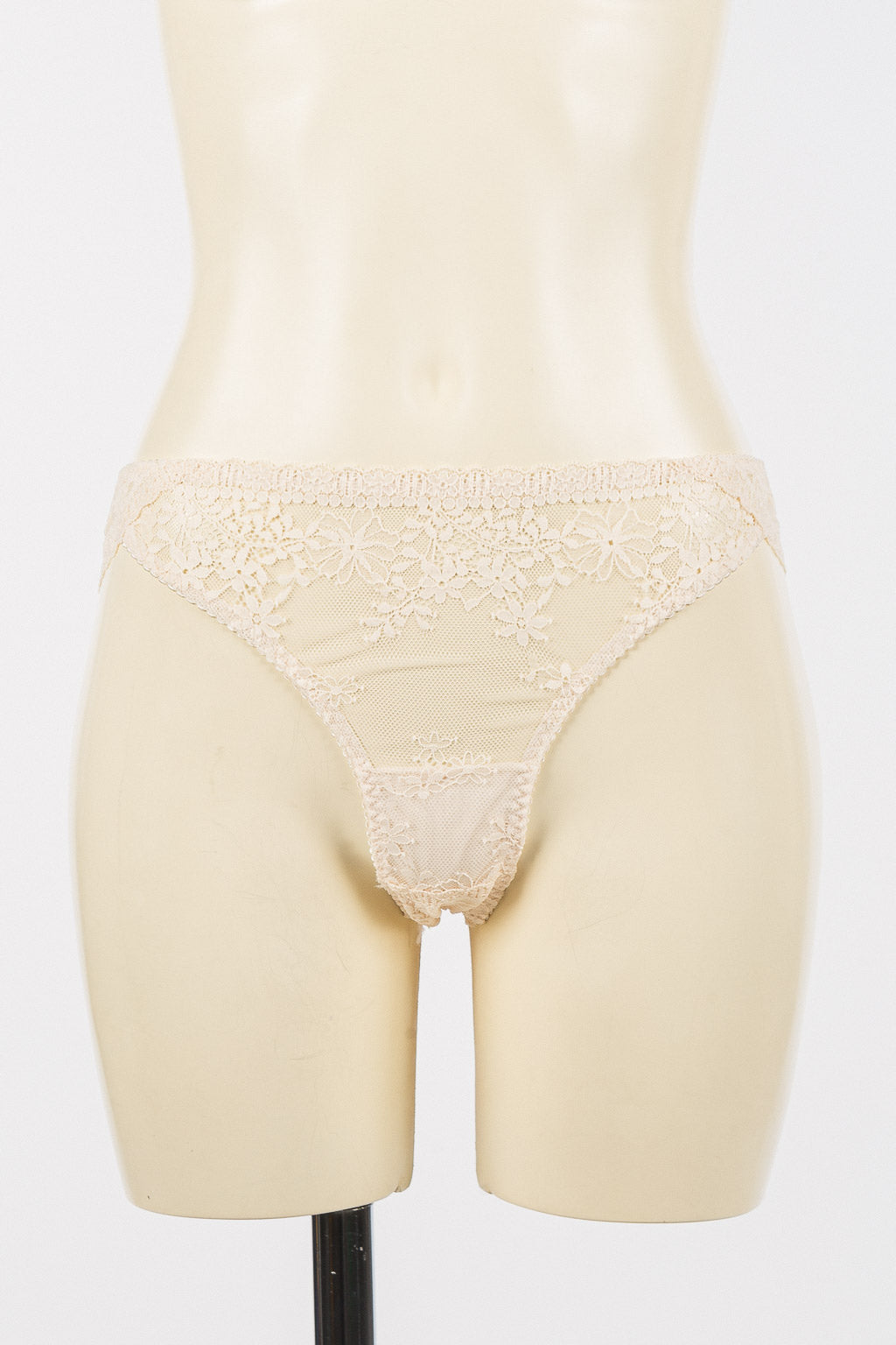 Slip brasiliana in pizzo smerlato a motivo floreale, fiocco in organza e logo a cuore in metallo al centro sul retro.