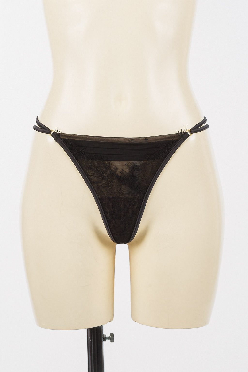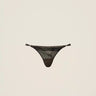 Slip perizoma in pizzo Chantilly smerlato e tulle con pieghe centrali, fianchi in jersey lucido in tono con anelli dorati, placchetta logo Oval T in metallo sul retro.
