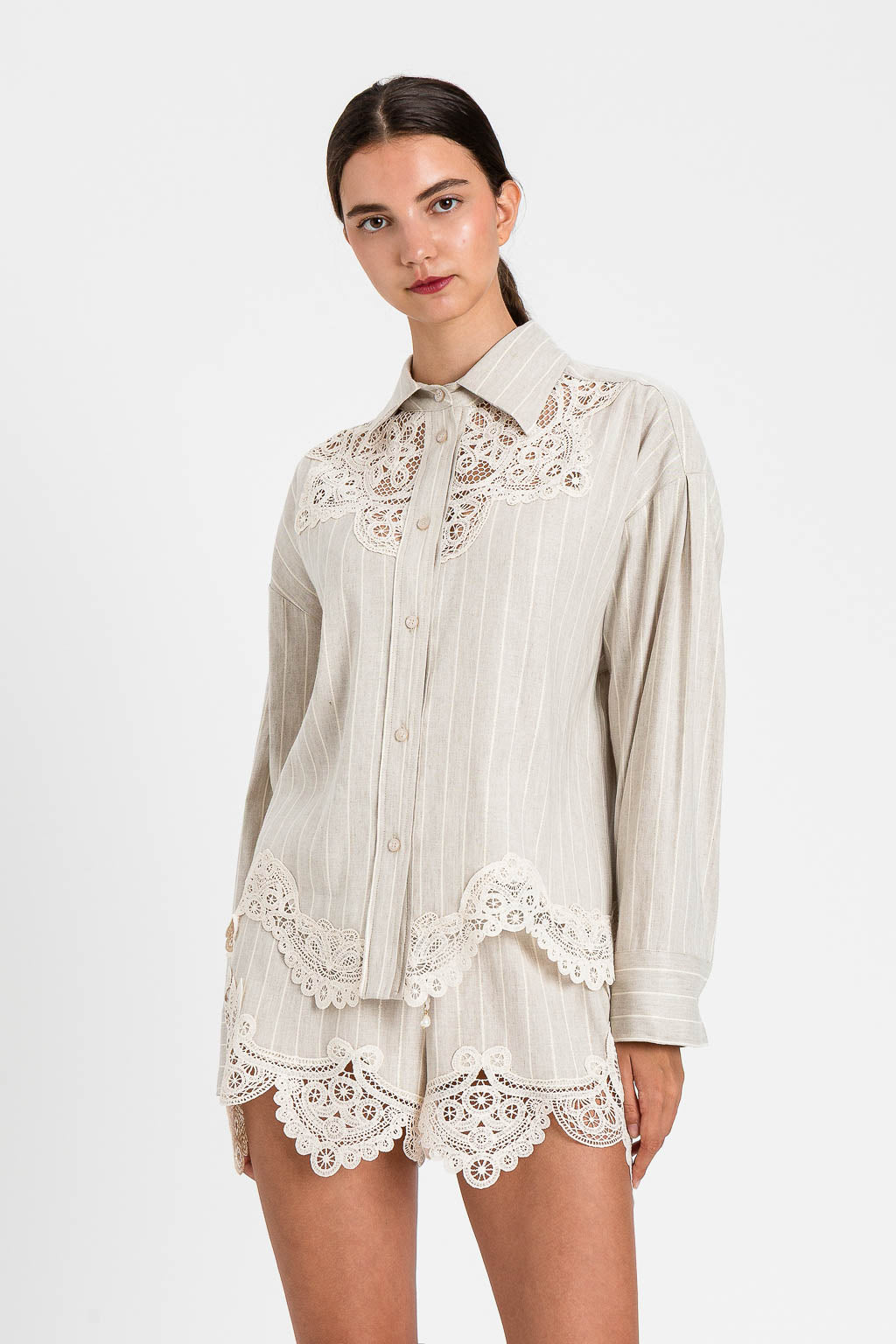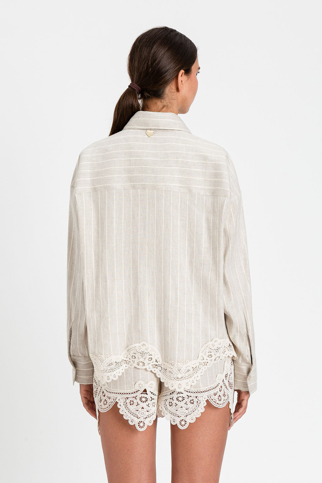 Camicia in misto lino jacquard a motivo righe con lurex dorato e applicazione di macramè in trasparenza. Ha chiusura con bottoni logati effetto madreperla, maniche lunghe con polsino e bottone, fondo asimmetrico e smerlato, placchetta logo a cuore in metallo sul retro, linea morbida.