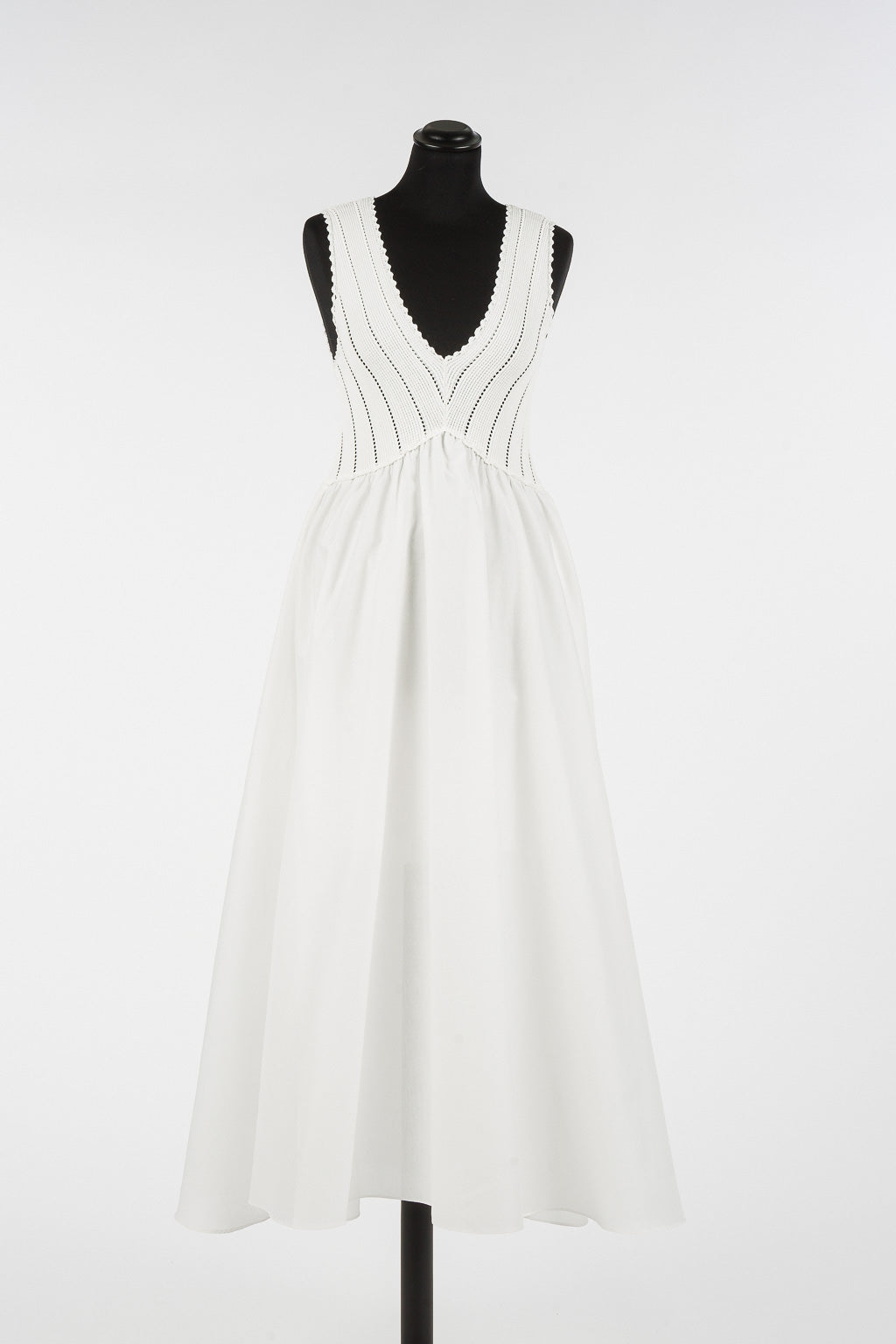 Abito lungo con corpetto in maglia di cotone a coste punzonate e gonna in tessuto. Ha scollatura a V, tagli diagonali e pieghe in vita, logo a cuore in metallo sul retro, linea svasata.