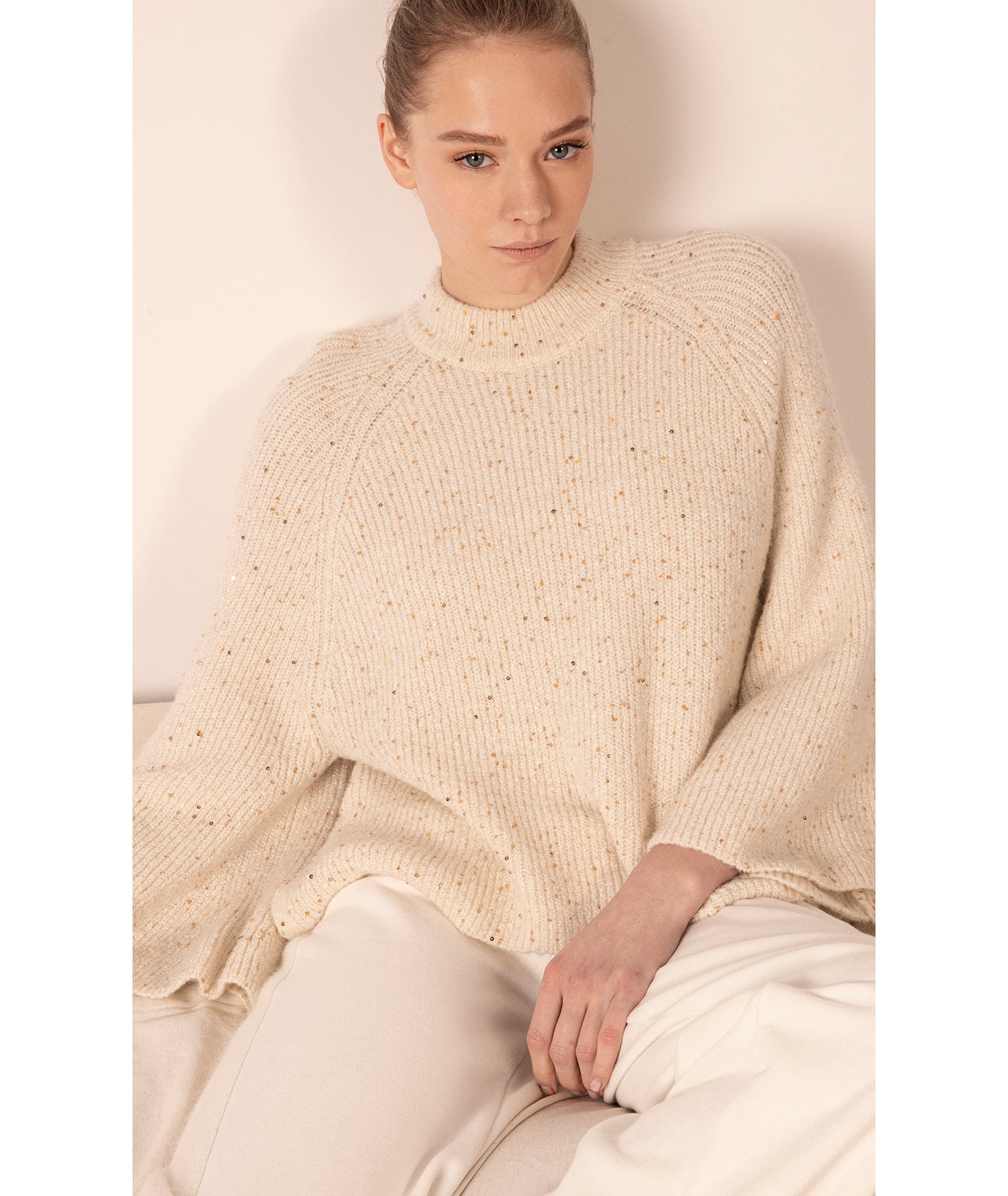 Maglia in filato di paillettes con girocollo, maniche a tre quarti leggermente svasate al fondo, placchetta logo a cuore sul retro, linea ampia a cappa.