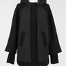Caban in tessuto scuba e nylon trapuntato con cappuccio. Ha maniche lunghe raglan con polso largo e polsino antivento in costina, chiusura con zip in metallo coperta da patta con bottoni automatici ricoperti, tasche a filetto, placchetta logo in metallo sul cappuccio, linea leggermente svasata.