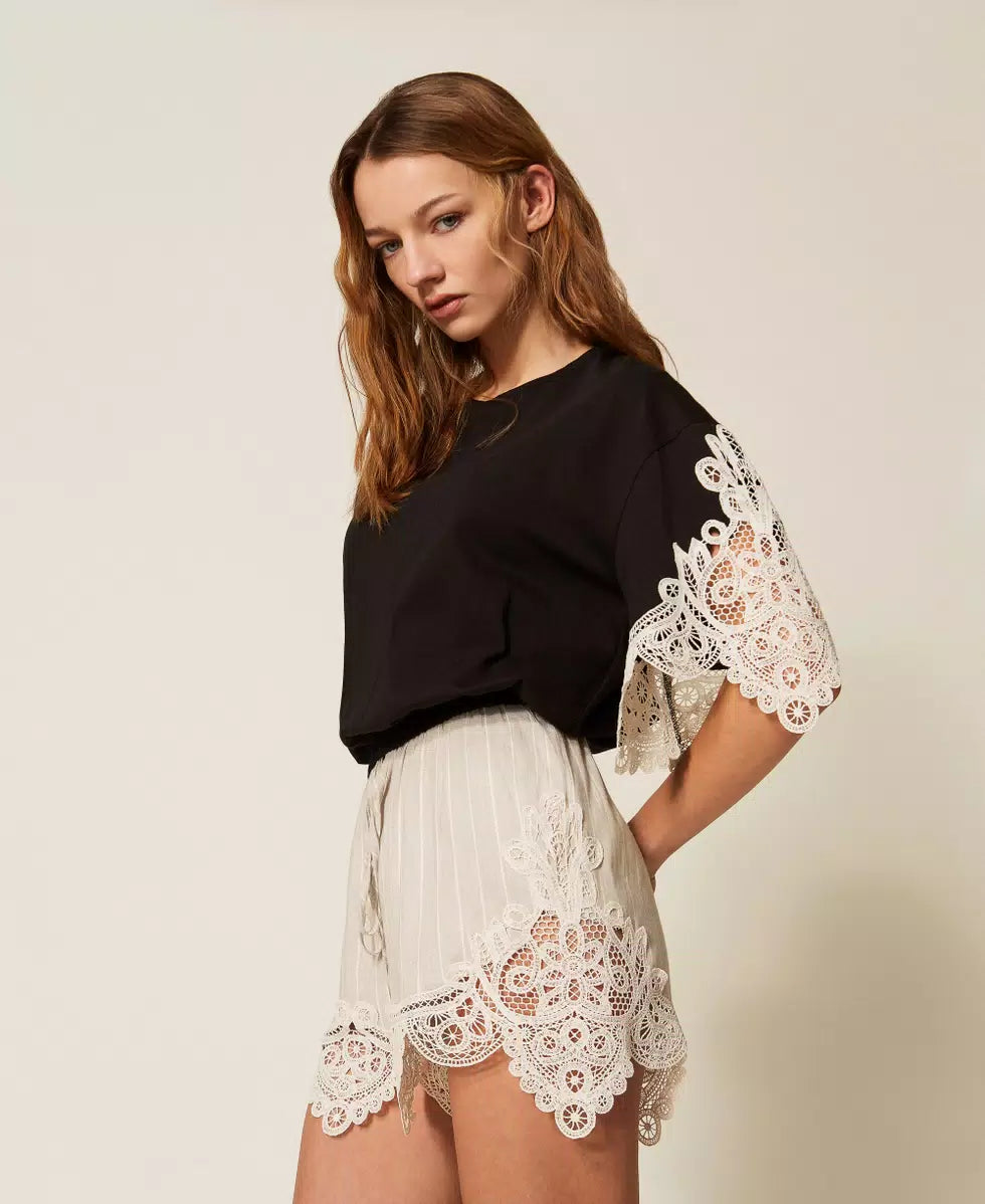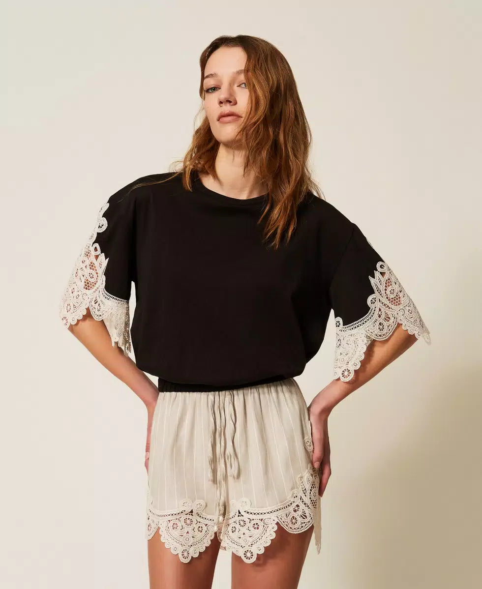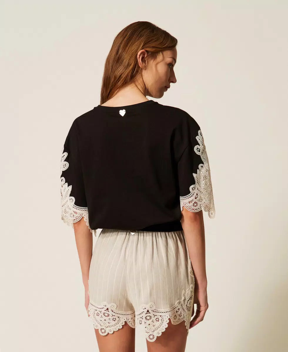 Blusa in jersey di cotone con dettagli in macramè smerlato a contrasto. Ha collo tondo, maniche al gomito con spalle scese, fondo con elastico, placchetta logo a cuore in metallo sul retro, linea morbida.
