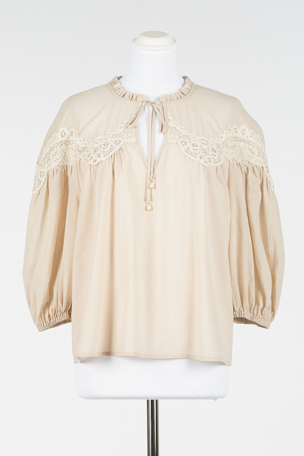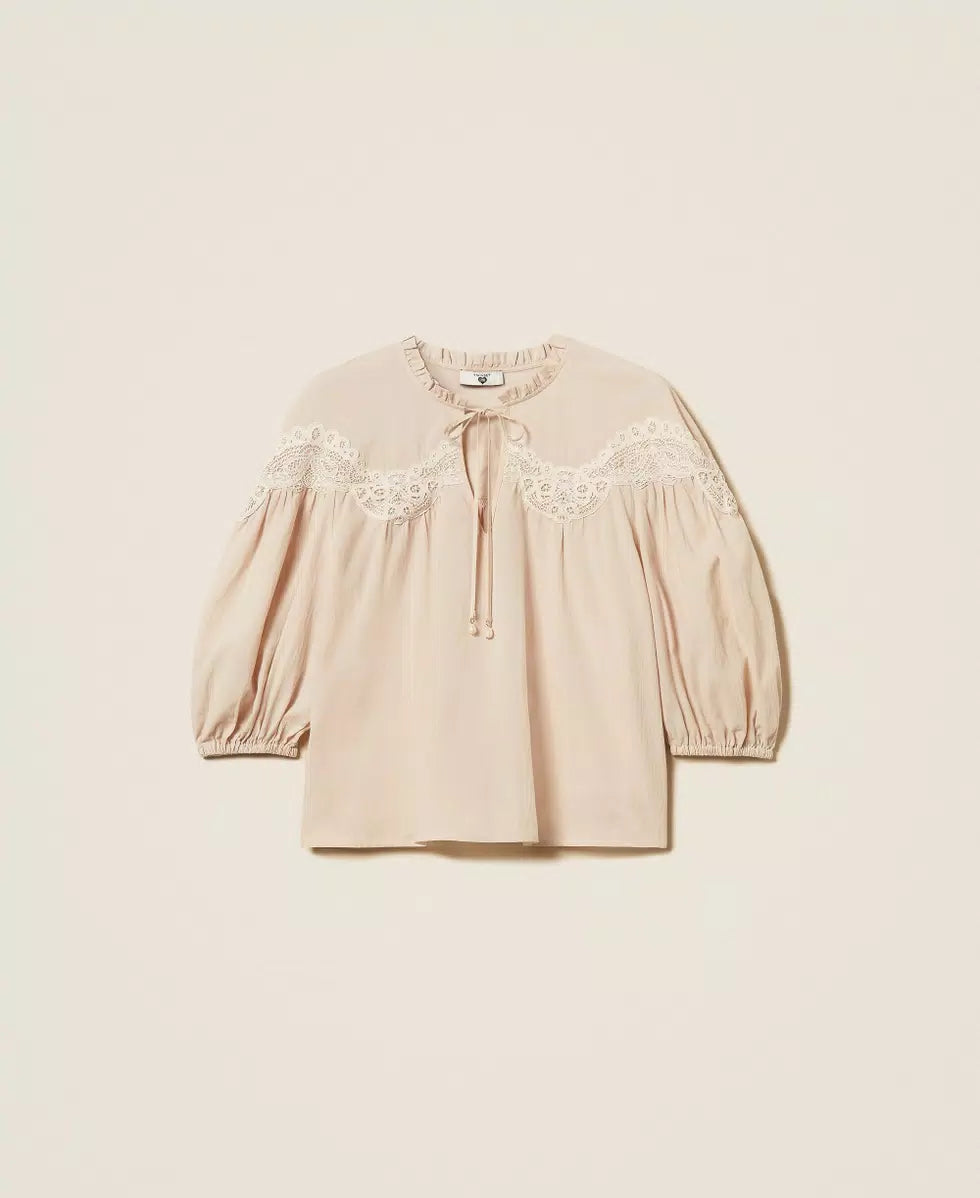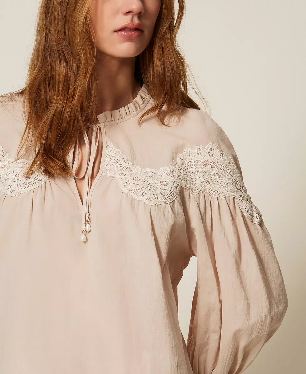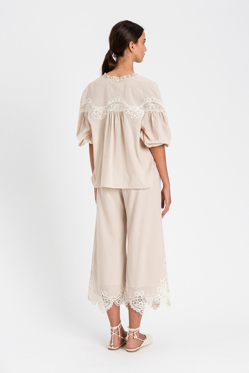 Blusa in mussola di cotone con dettagli in macramè smerlato al carré. Ha collo tondo con apertura e nastri con terminali a perla pendente, maniche balloon lunghe al gomito con fondo elastico, logo a cuore in metallo sul retro, linea morbida.