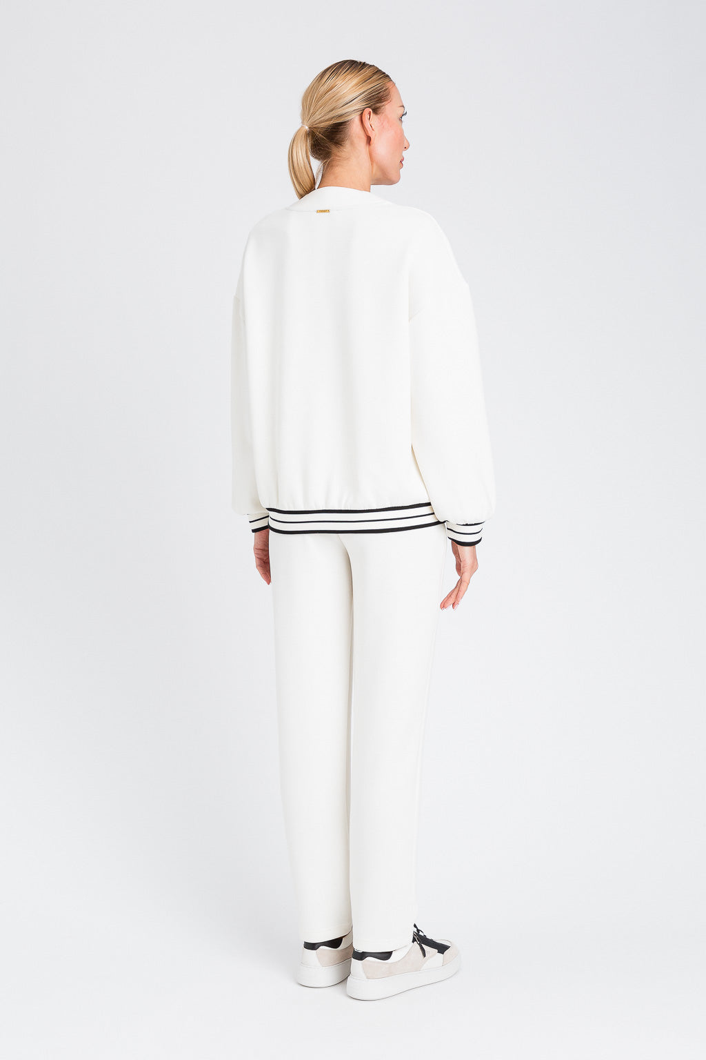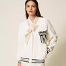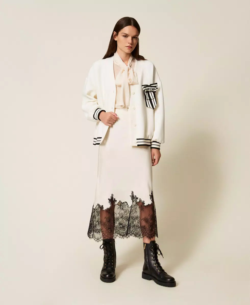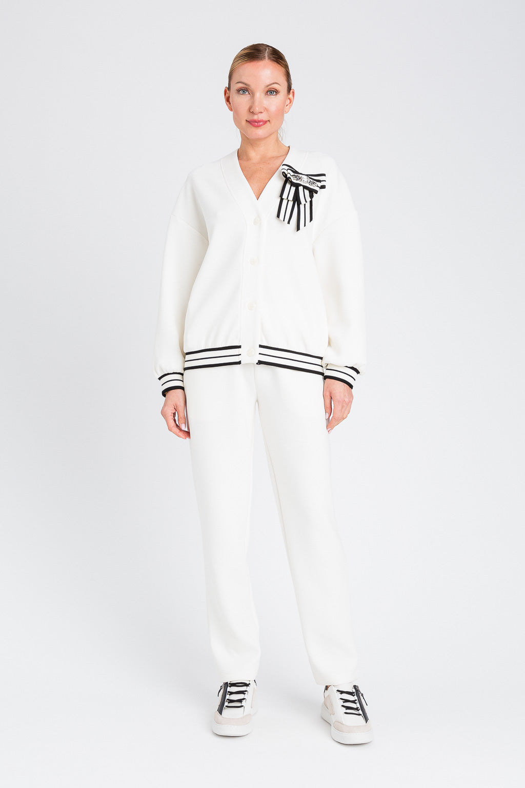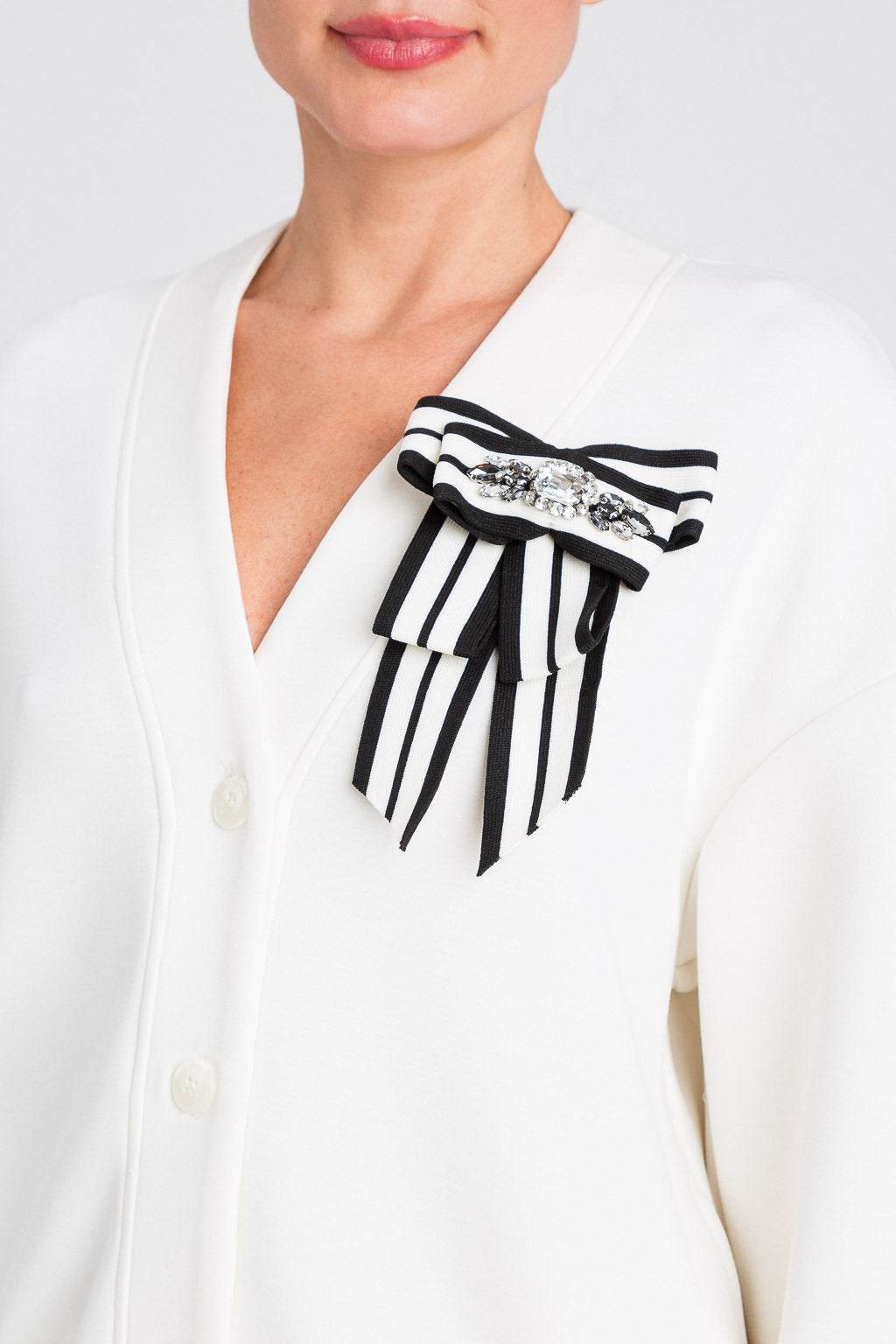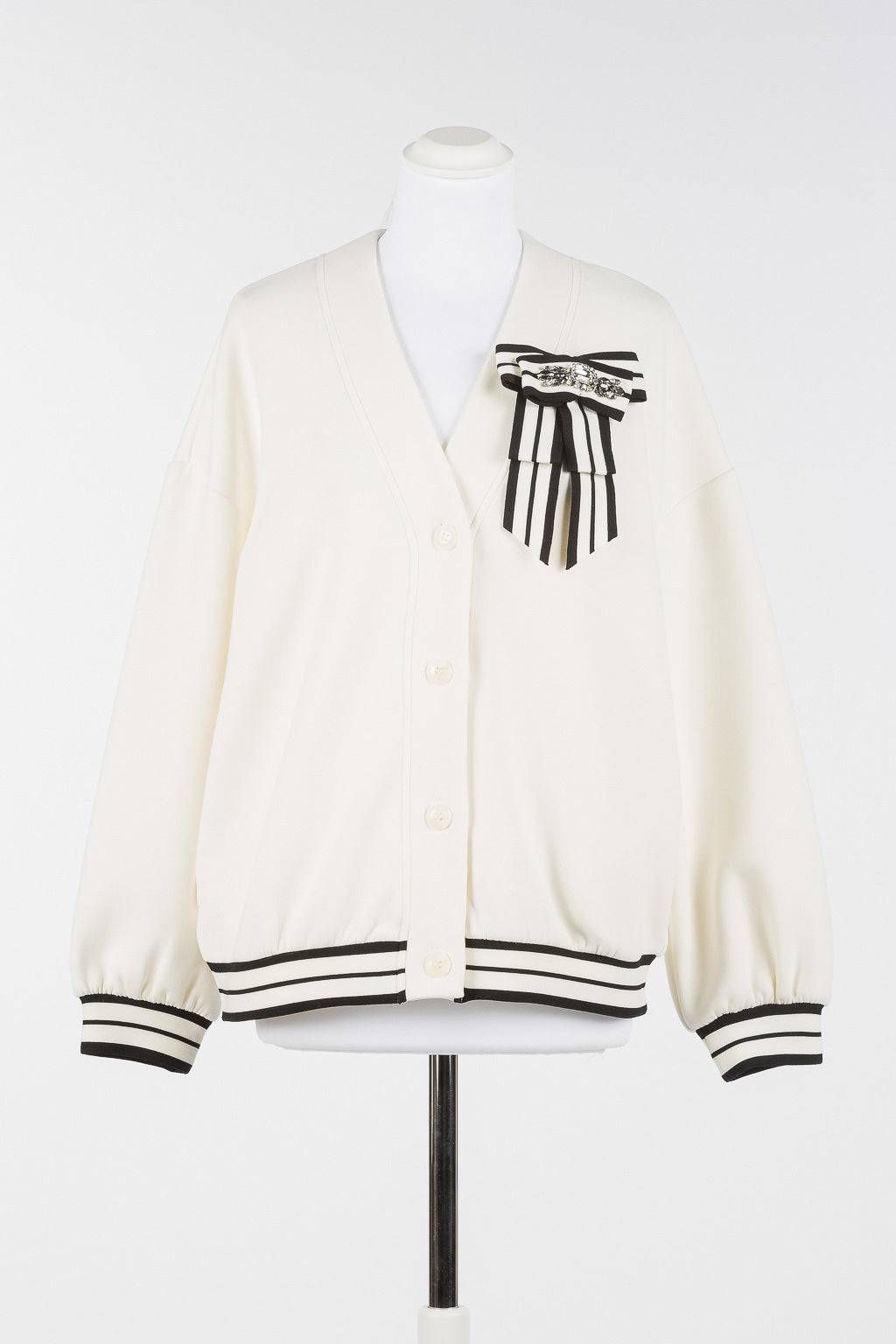 Cardigan in tessuto scuba con spilla rimovibile in fettuccia con castoni. Ha fondi rifiniti da fettuccia smacchiata a righe irregolari, scollatura a V, maniche lunghe, chiusura con bottoni, tasche inserite ai fianchi, placchetta logo a cuore sul retro, linea morbida.