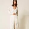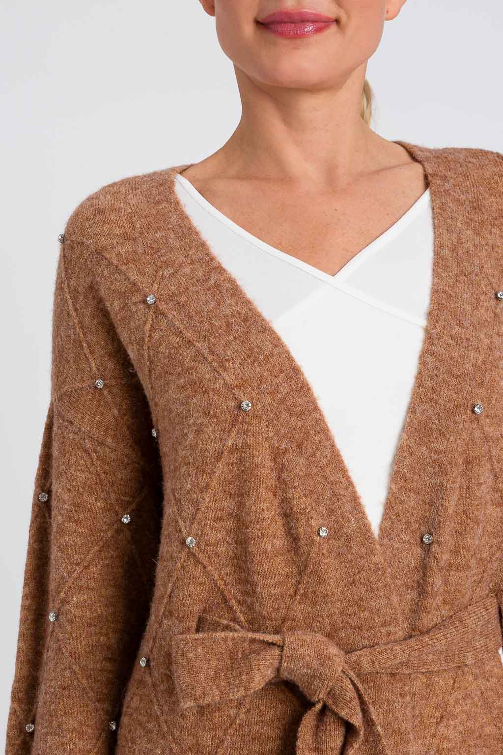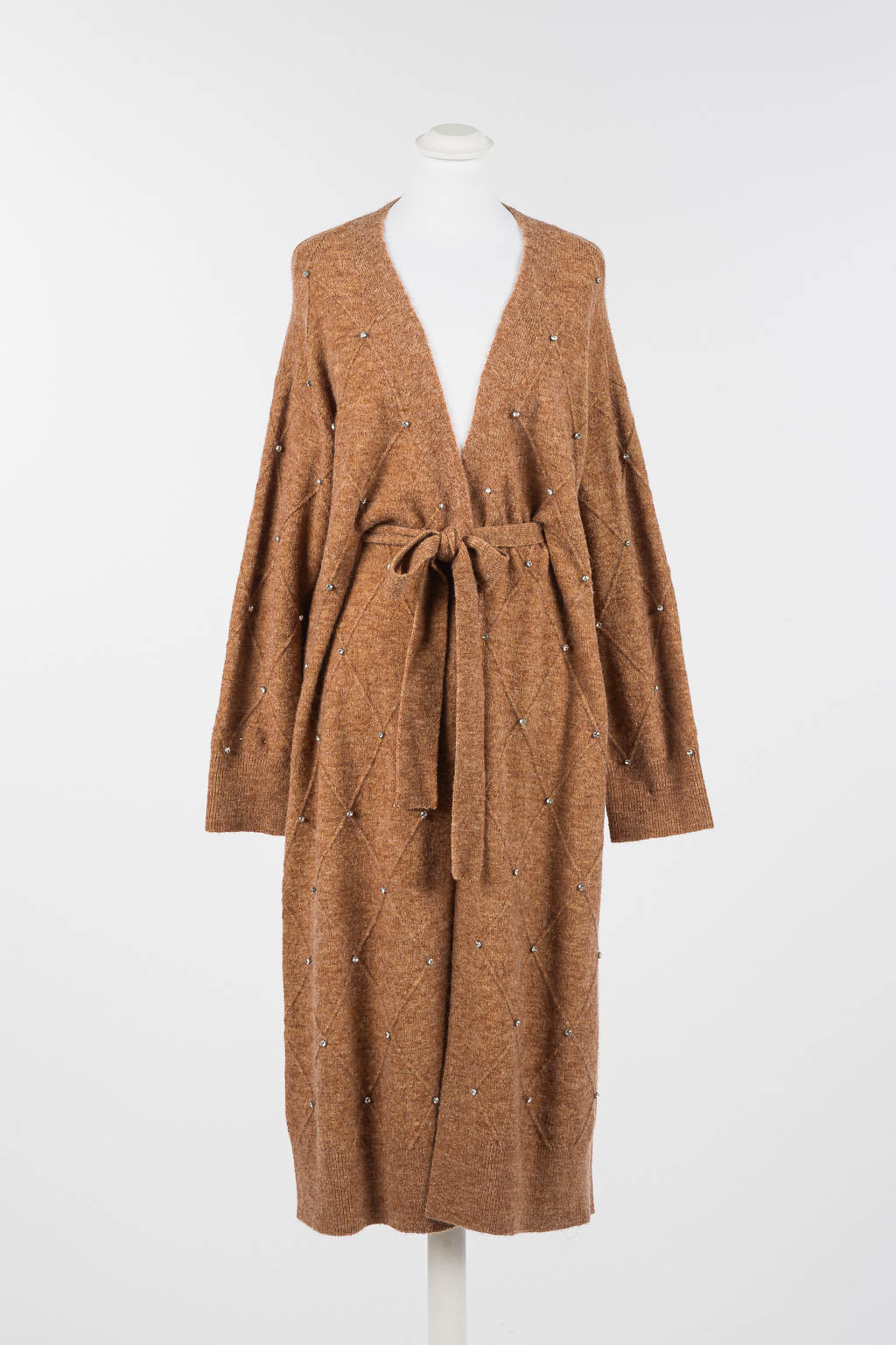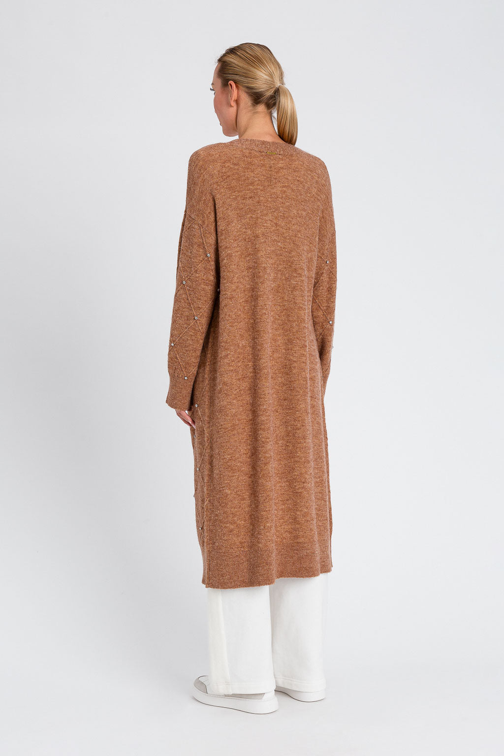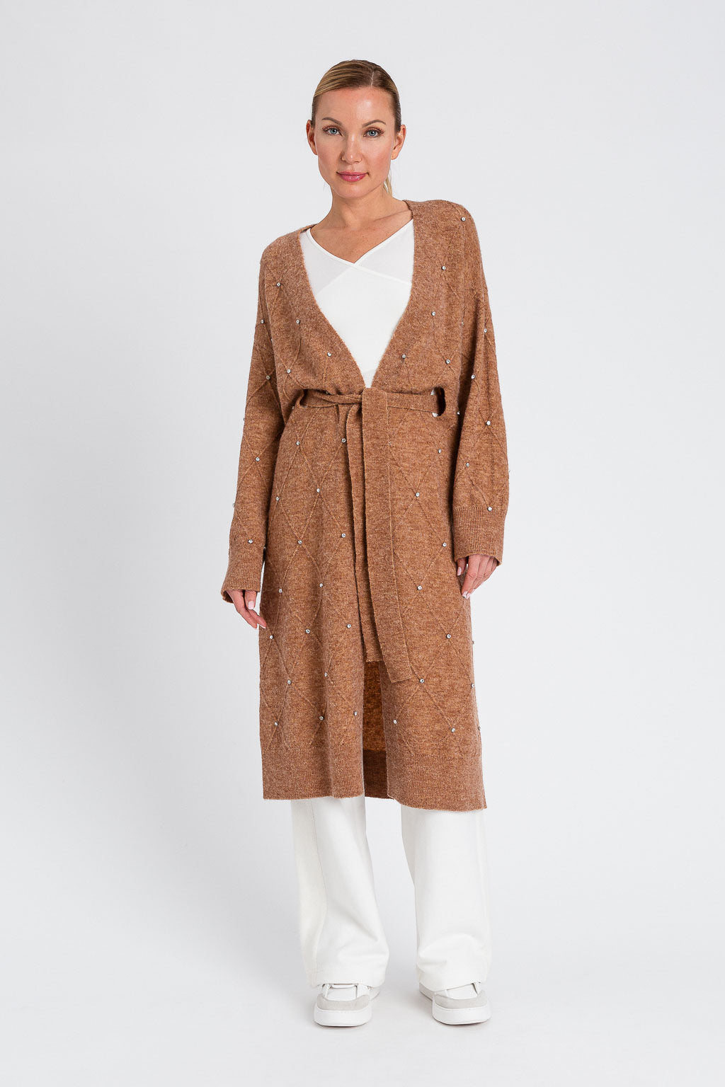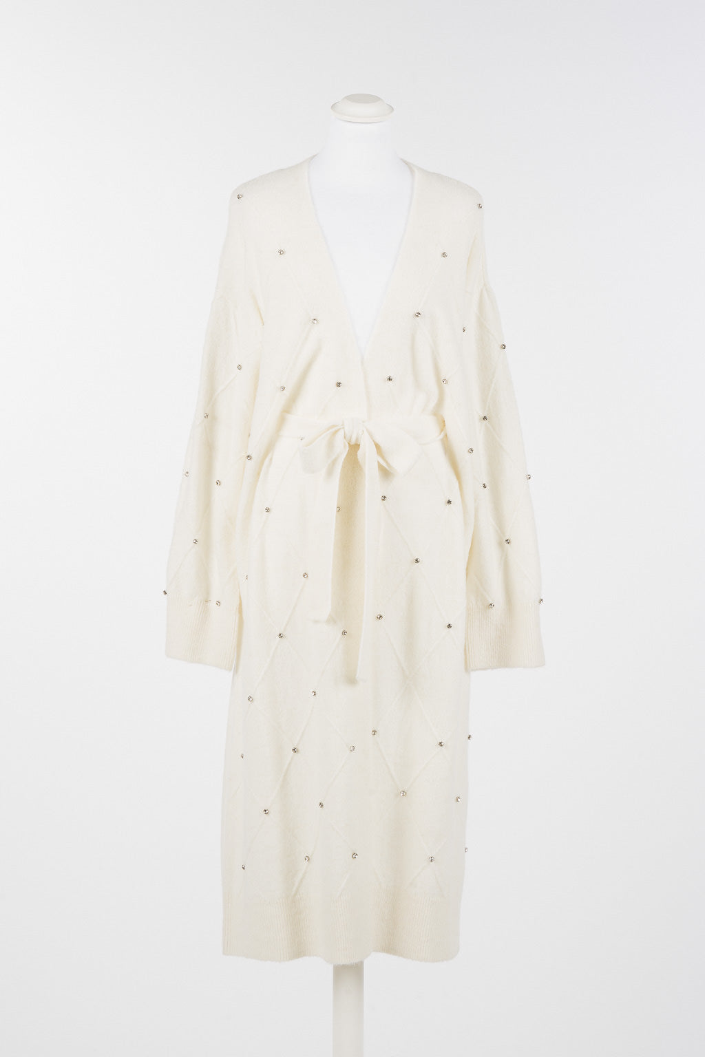 NCardigan lungo in filato di viscosa con motivo a rombi in tessitura davanti e ricamo di cabochon. Ha scollatura a V, maniche lunghe, profili rifiniti a costine, placchetta logo a cuore in metallo, cintura in coordinato, linea morbida.