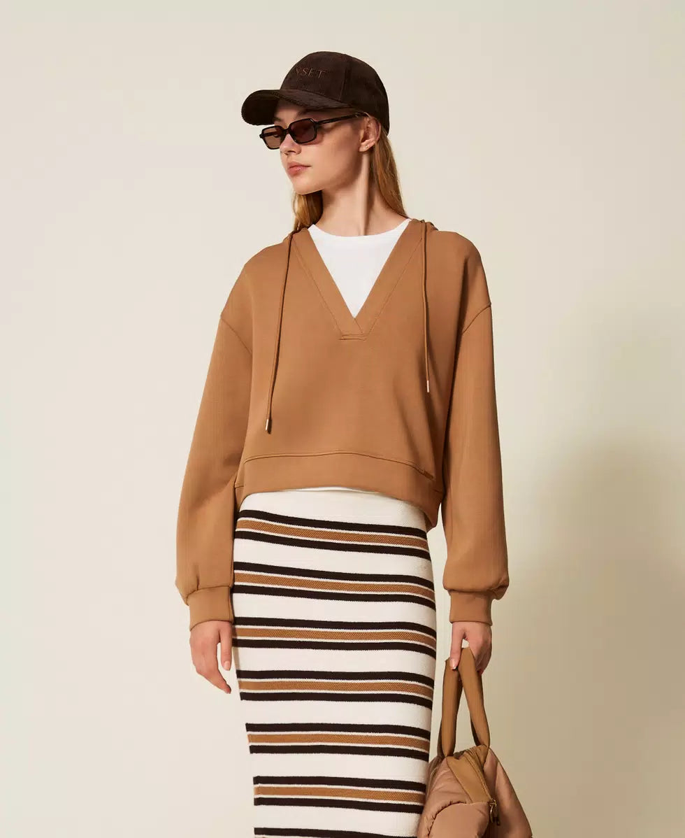 Felpa cropped in tessuto scuba con scollatura a V, maniche lunghe a giro con spalle scese, cappuccio con coulisse e terminali in metallo smaltato, polsi e fondo con bordo, linea morbida. È abbinata al top in jersey di cotone con girocollo rifinito a costine, spalle larghe, placchetta logo in metallo davanti, linea dritta.