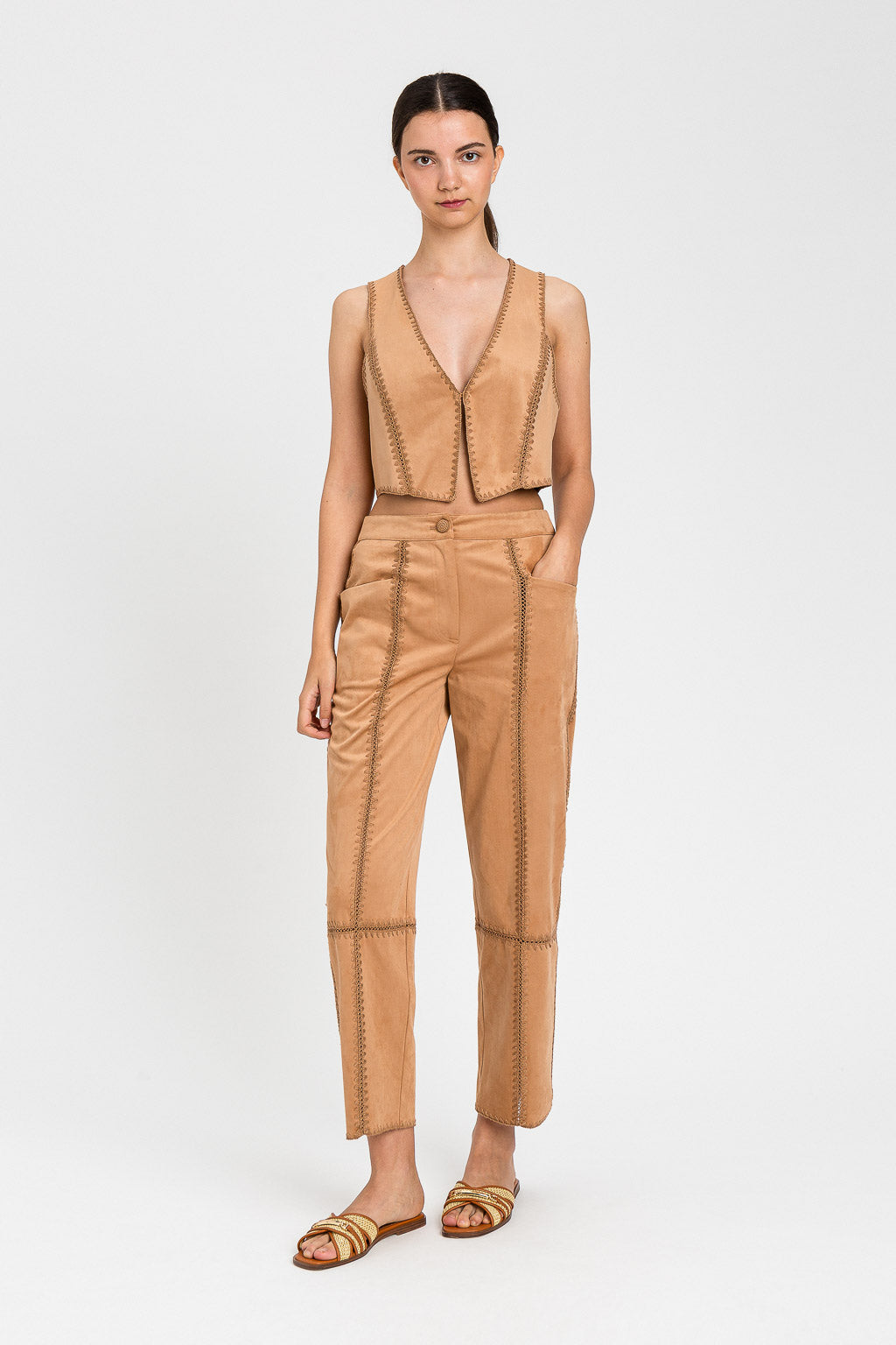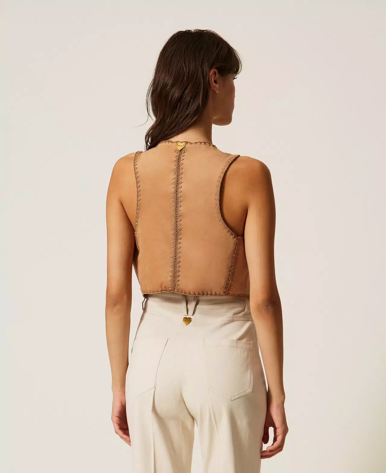 Gilet in tessuto effetto pelle scamosciata con ricamo punto sella che oltre a rifinire il capo crea dei giochi di trasparenze. Ha scollatura a V con tagli fianchetto, chiusura con gancetto ricoperto in filo, fondo asimmetrico, logo a cuore in metallo sul retro, linea fitted.