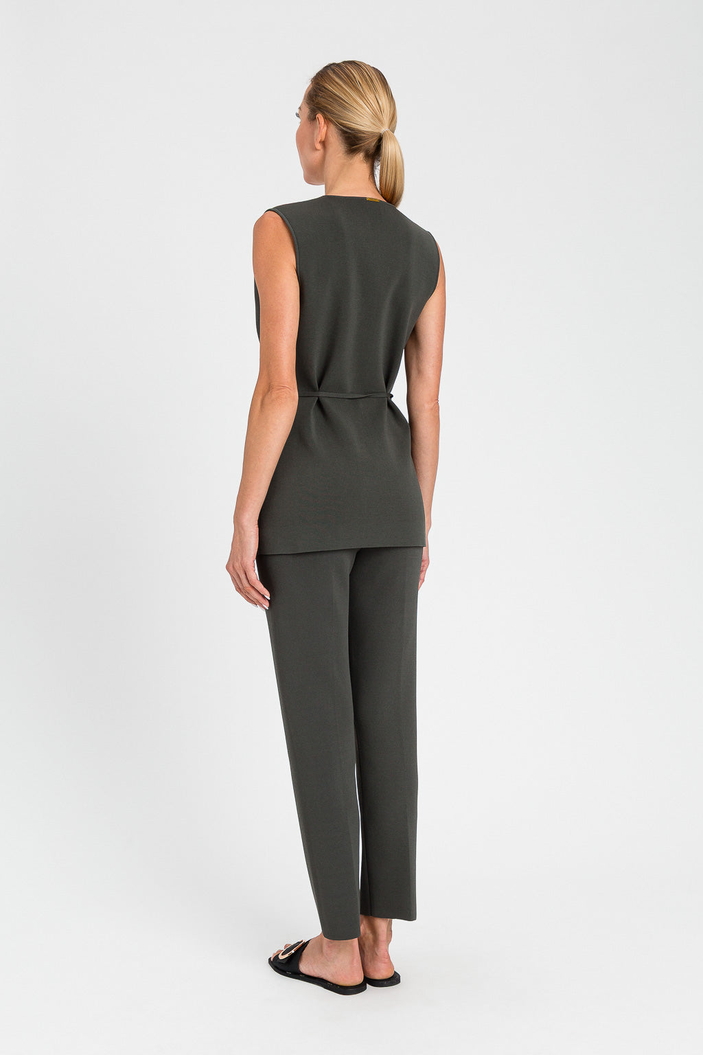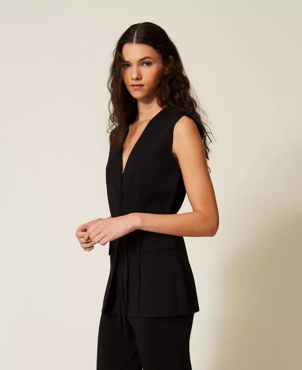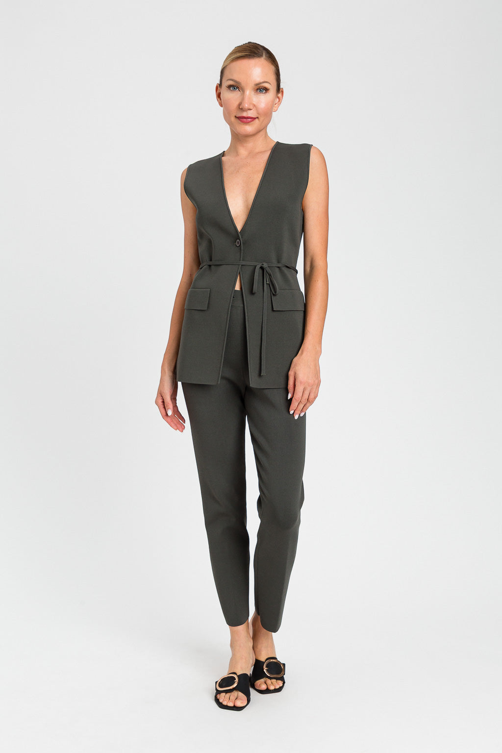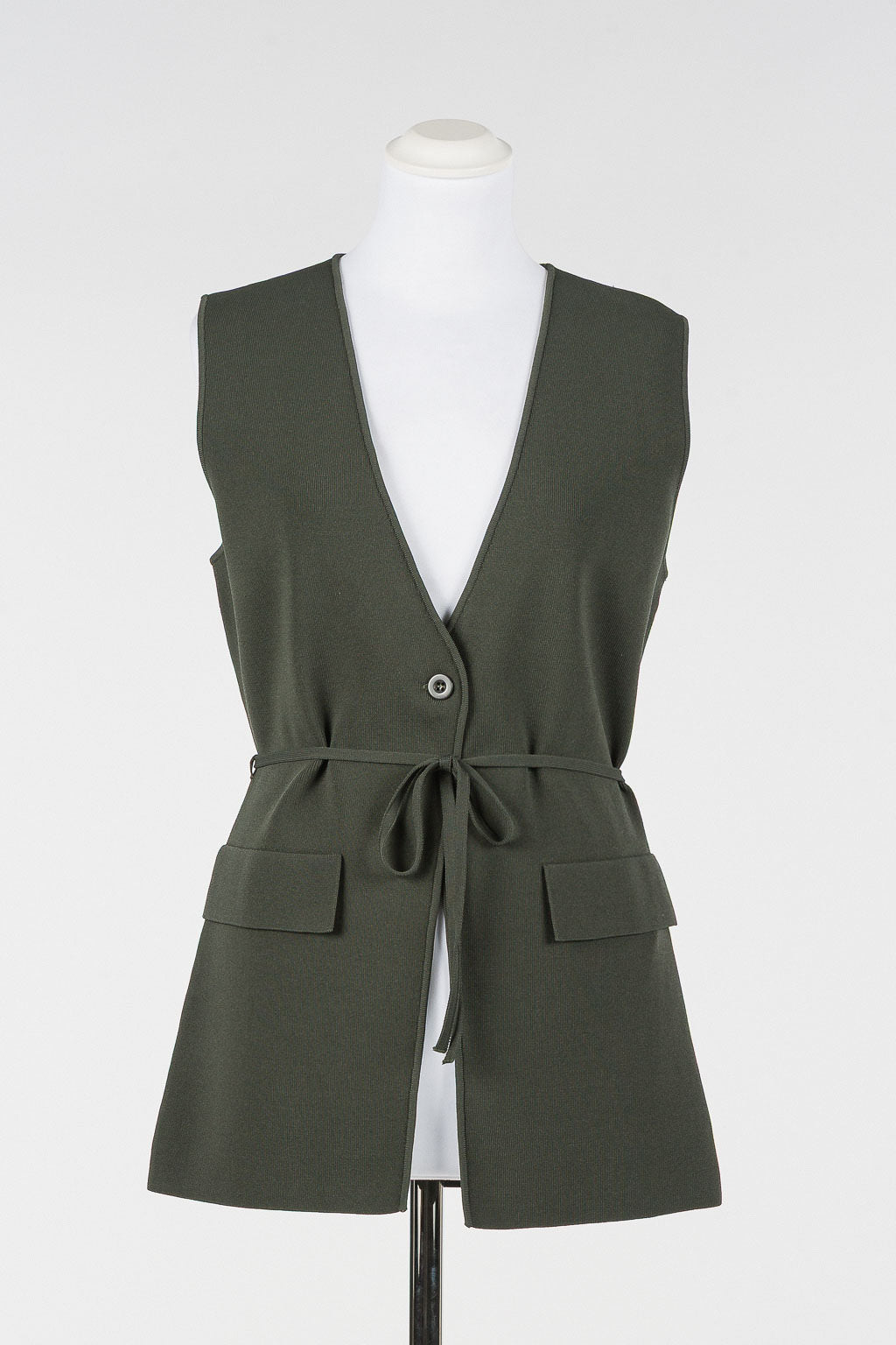 Gilet in maglia di misto viscosa con cintura sottile rimovibile in vita. Ha scollatura a V, chiusura con bottone, patte davanti, logo a cuore in metallo sul retro, linea fitted.