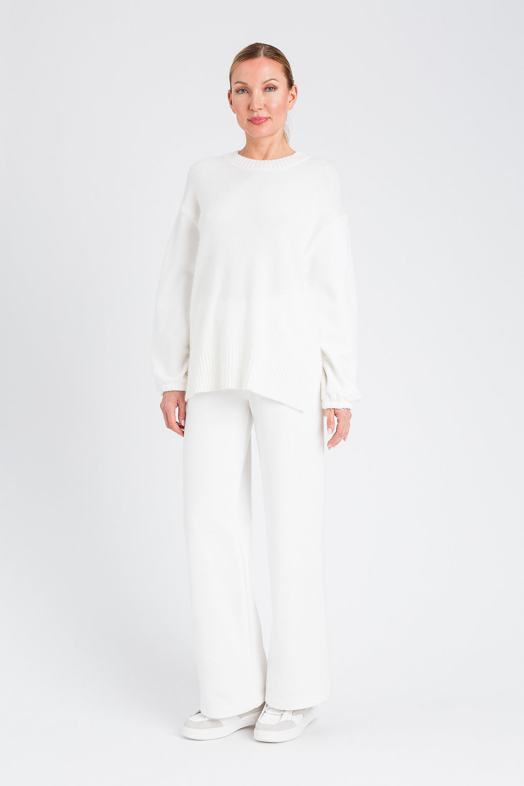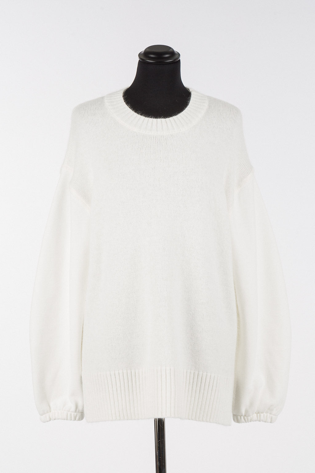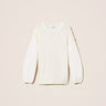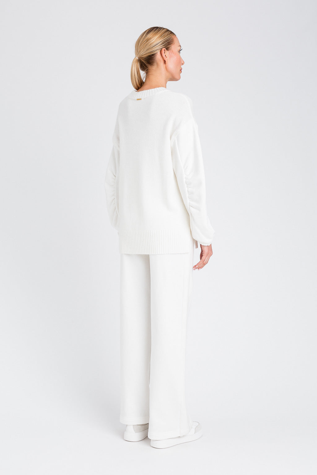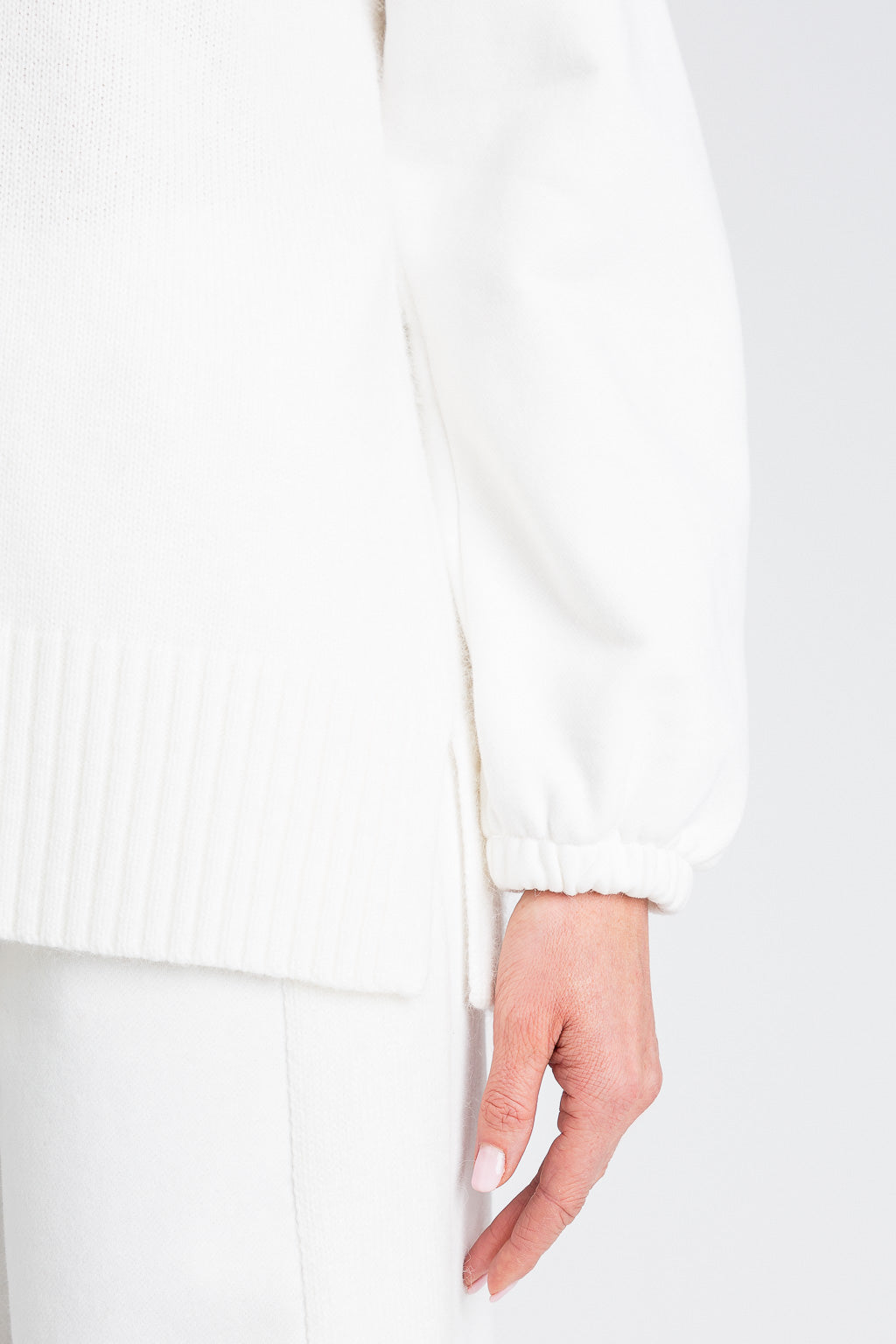 Maglia in misto viscosa tricot davanti e dietro con maniche in felpa di cotone. Ha collo tondo, maniche lunghe con elastico ai polsi, spacchetti laterali, dettagli rifiniti a costine, placchetta logo a cuore sul retro, linea morbida.