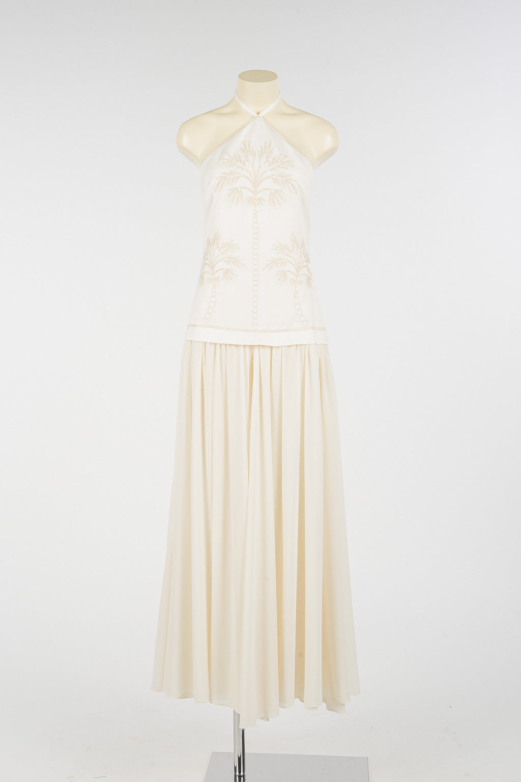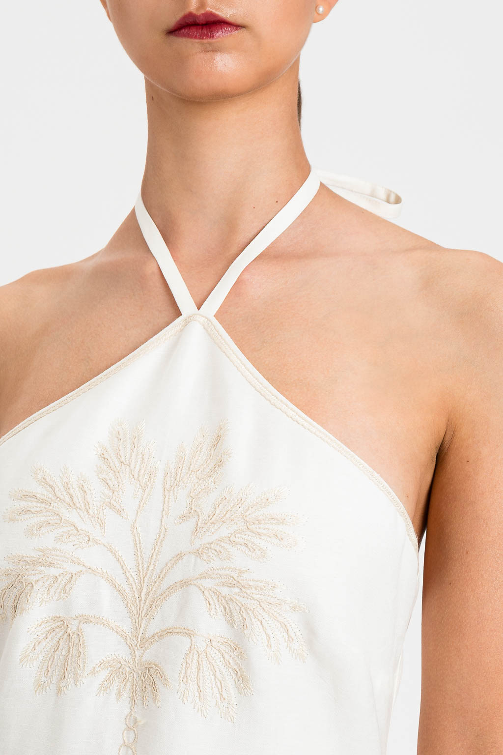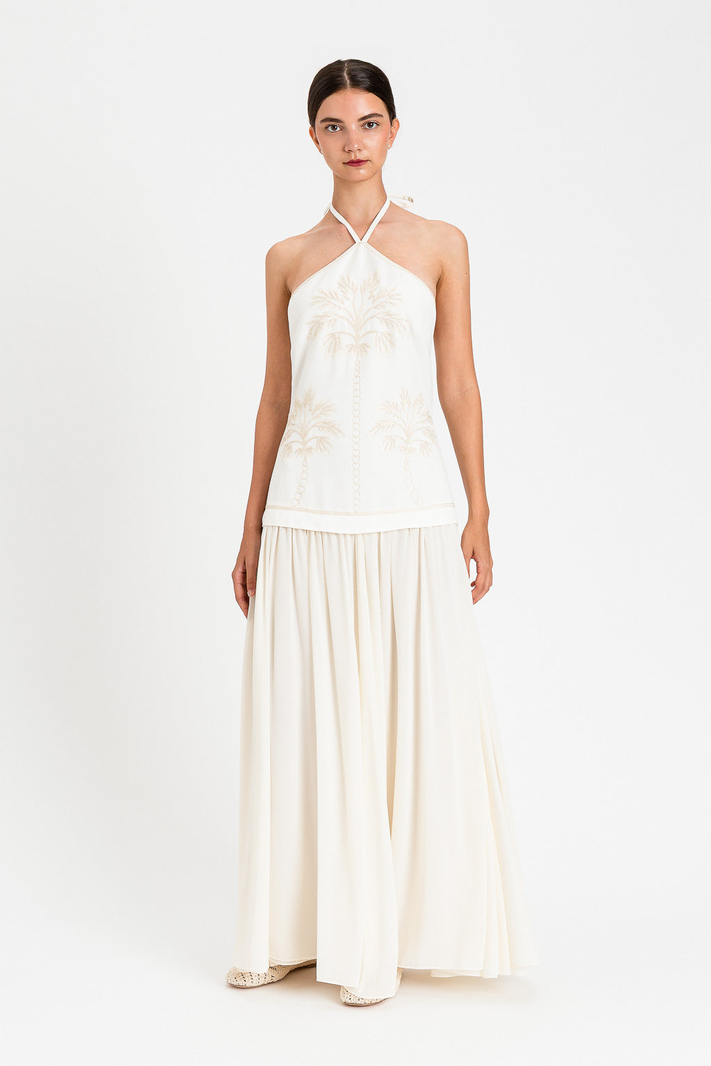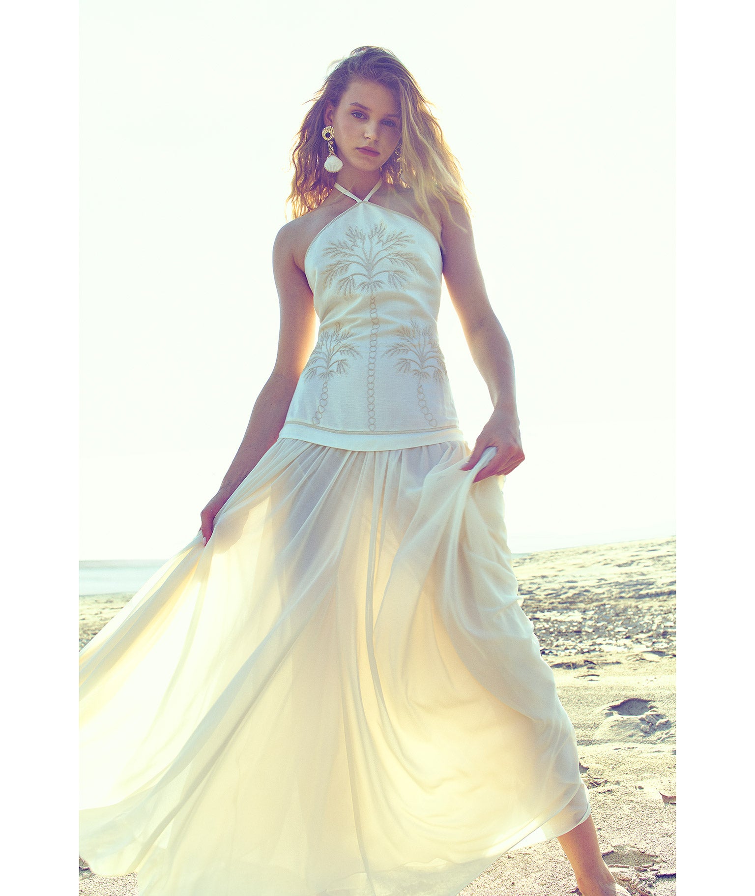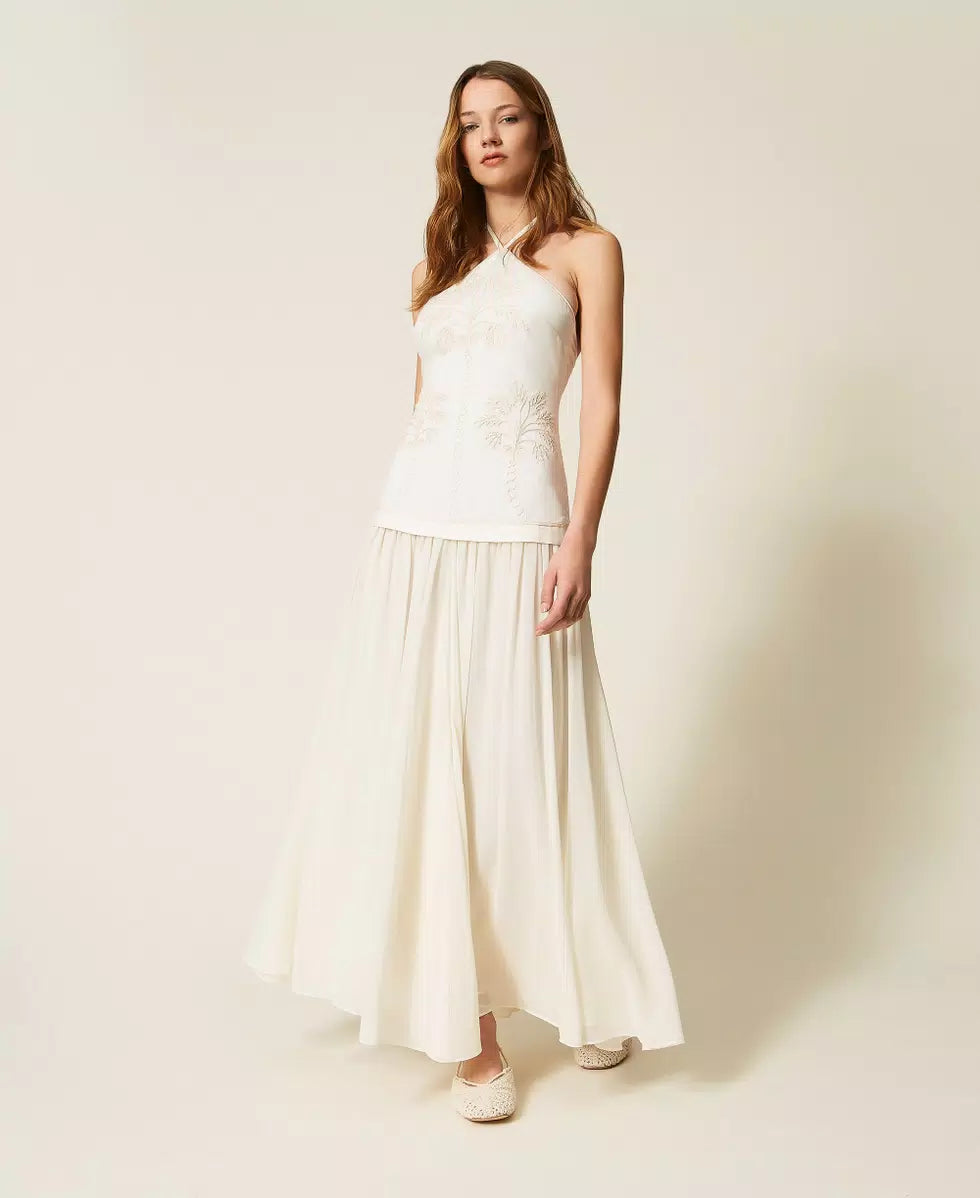 Abito lungo in misto lino e doppio strato di georgette. La parte superiore ha ricamo esclusivo Twinset di foglie Cornely con filo di spessori diversi, profili rifiniti da ricamo à jour, scollatura halter con lacci in tessuto, schiena scoperta, chiusura con zip sul retro. La gonna è ampia con spicchi inseriti che aumentano il volume al fondo, logo a cuore in metallo, linea fit & flare.