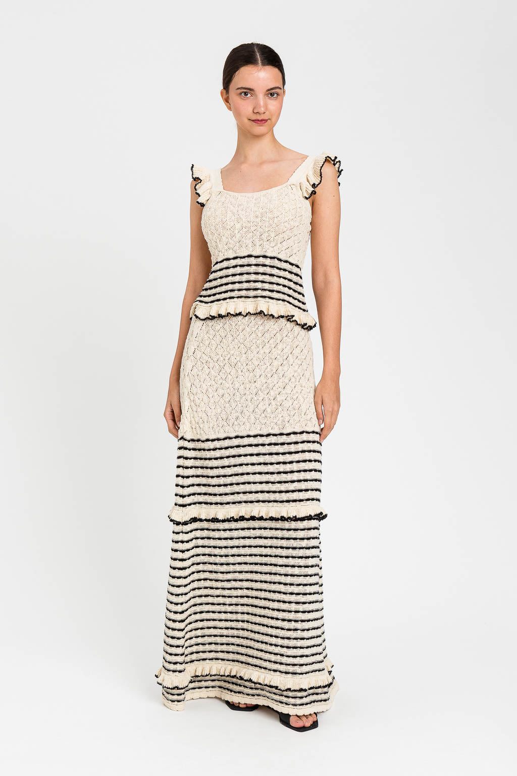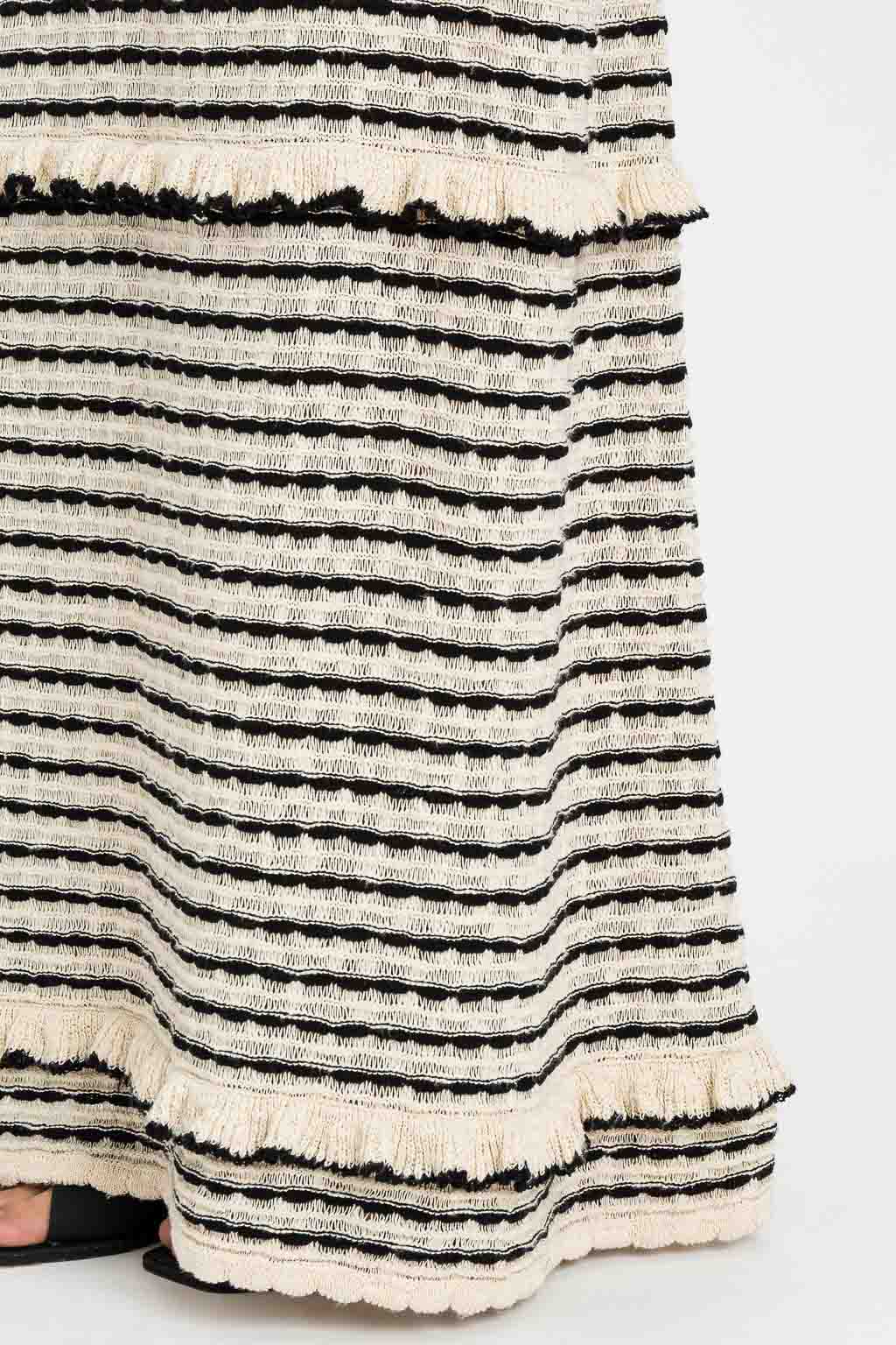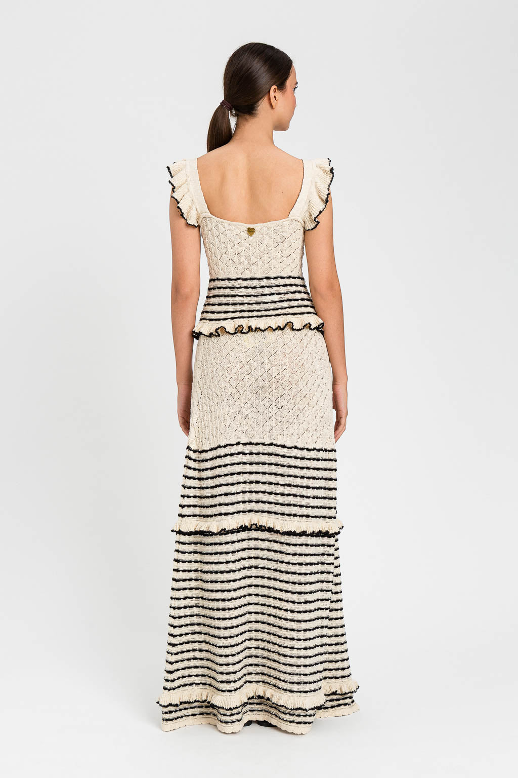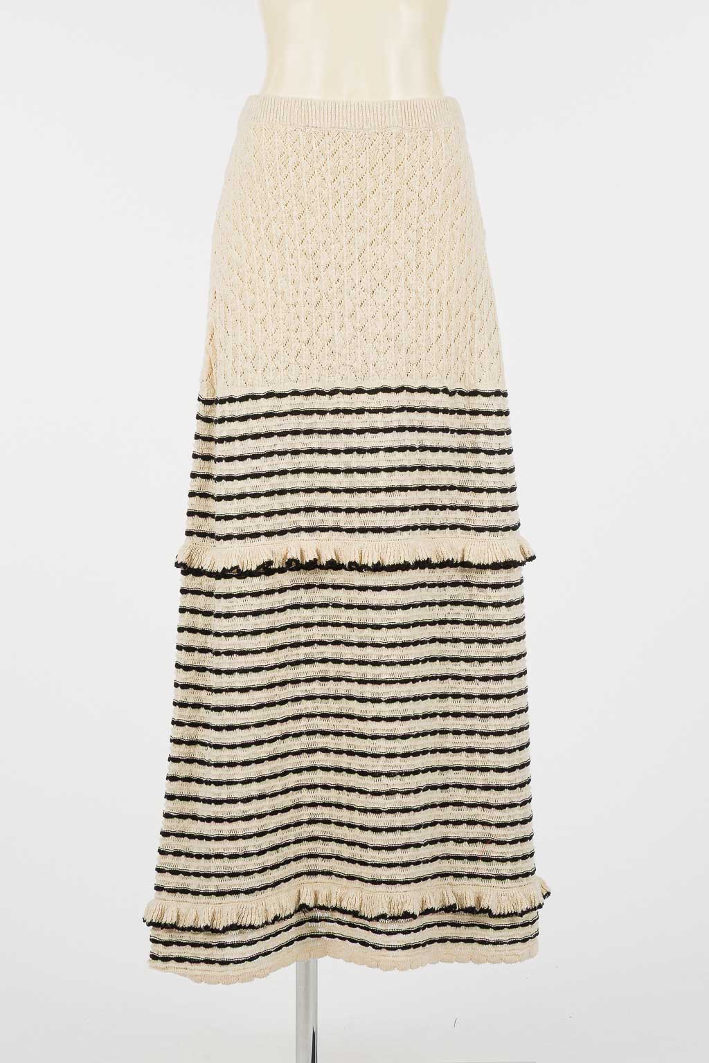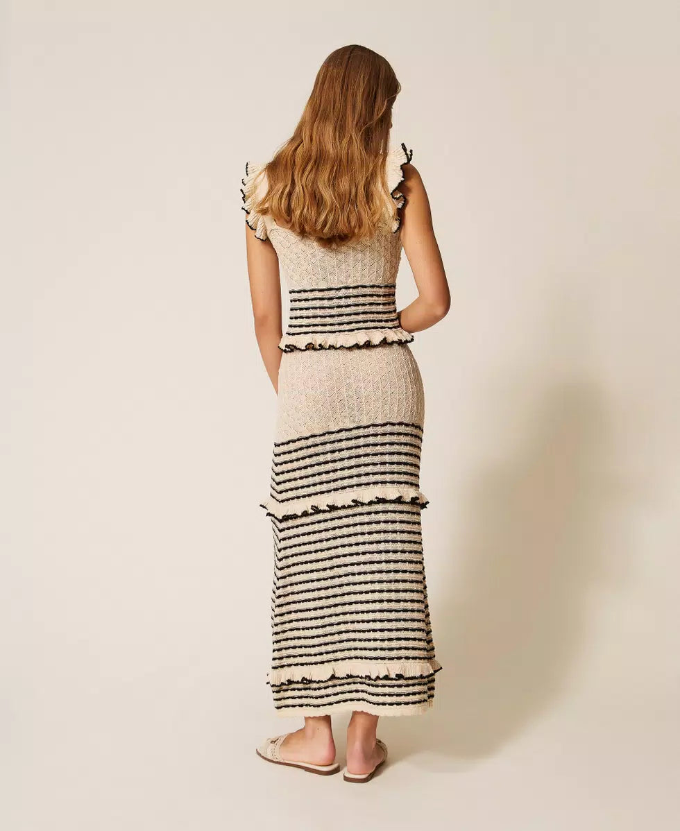 Gonna lunga in filato di misto cotone con righe di tubetti in colore a contrasto, alternati a piccoli volant. Ha elastico in vita, logo a cuore inmetallo sul retro, linea morbida.