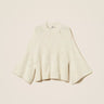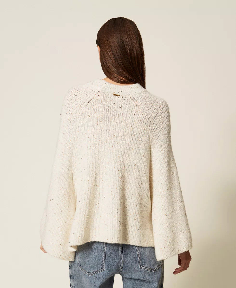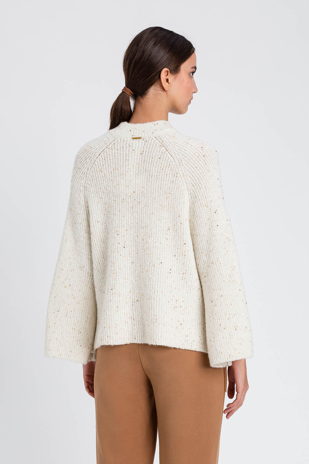 Maglia in filato di paillettes con girocollo, maniche a tre quarti leggermente svasate al fondo, placchetta logo a cuore sul retro, linea ampia a cappa.