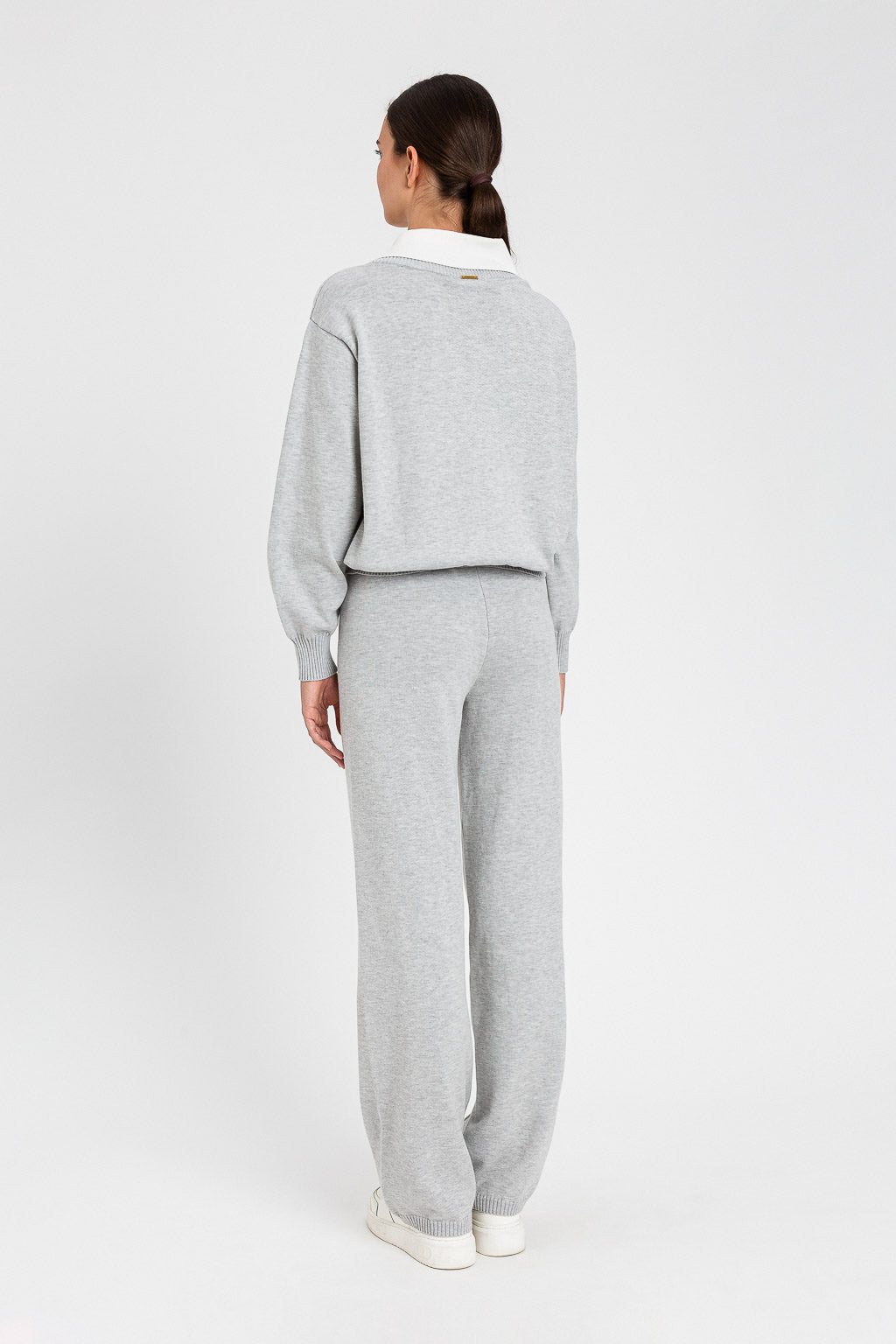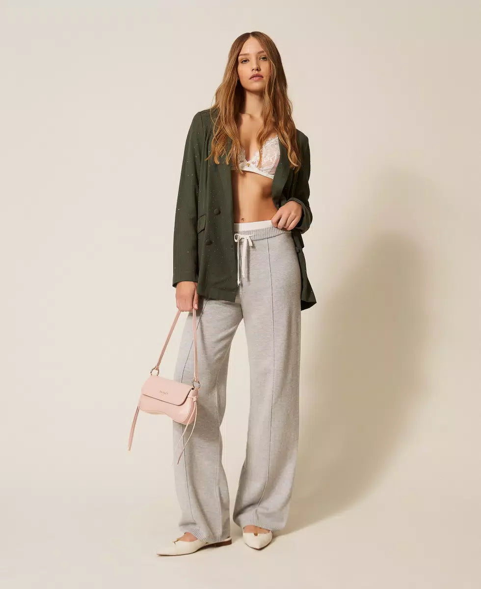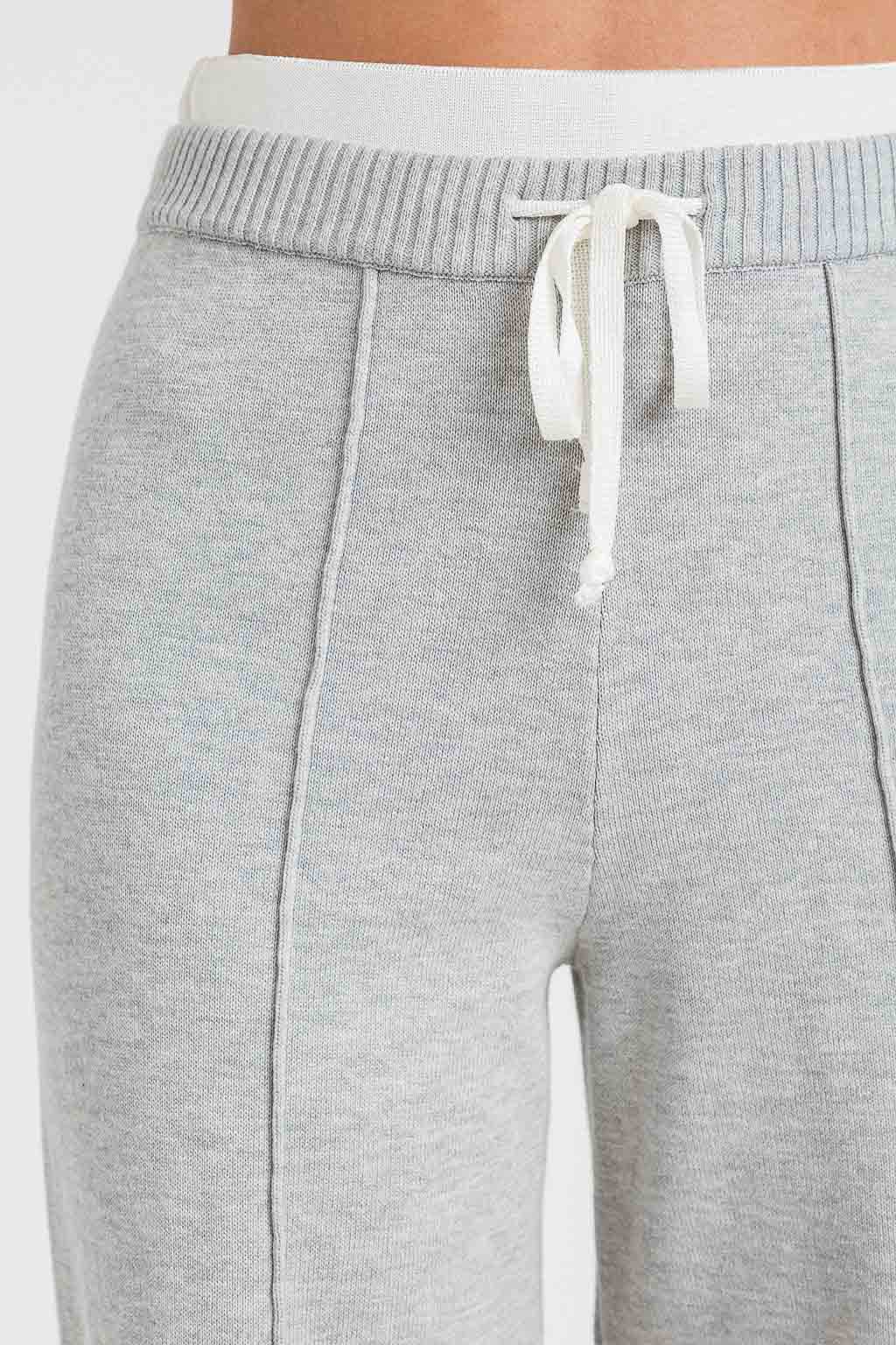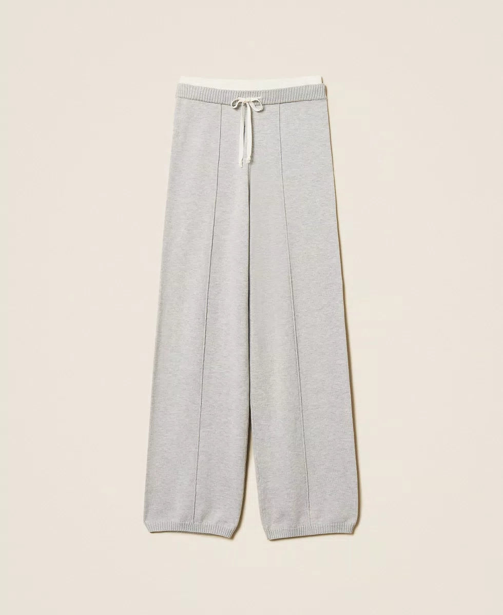 Pantaloni in filato di cotone e viscosa con inserto in colore a contrasto in vita, elastico inserito e coulisse, logo a cuore in metallo sul retro, linea morbida.