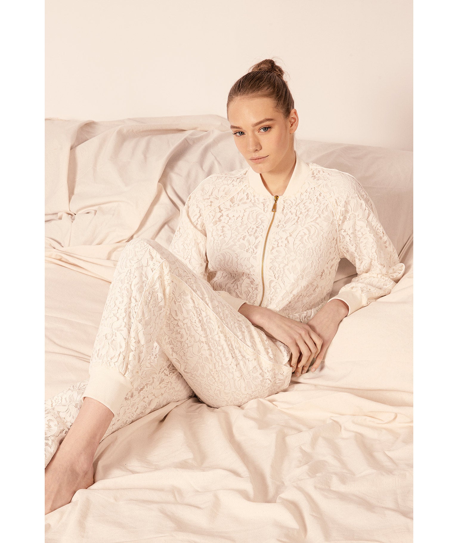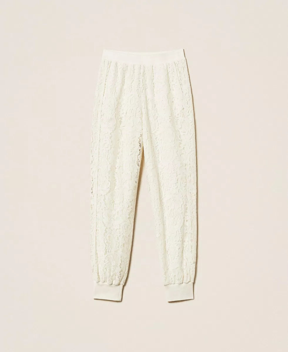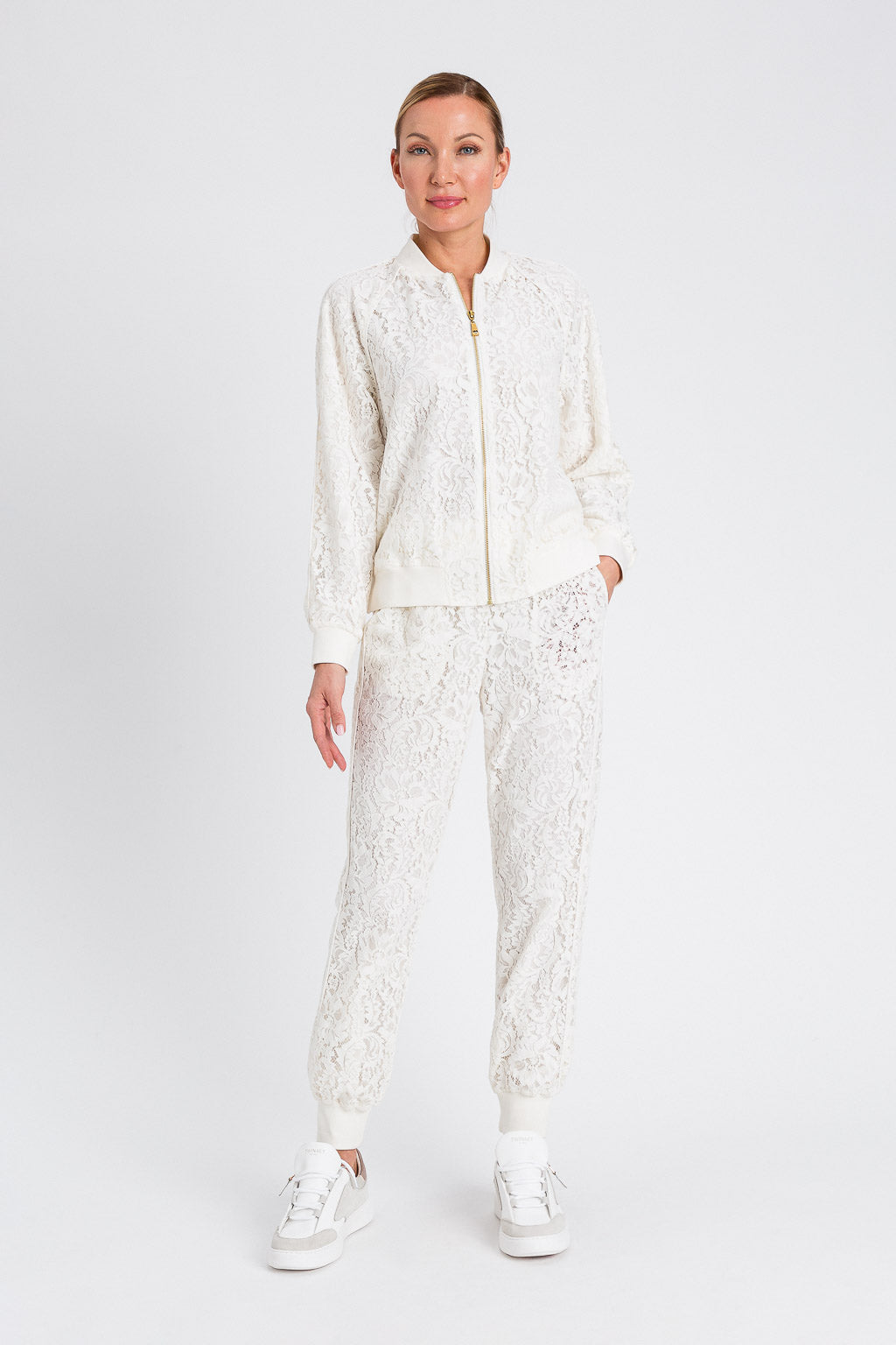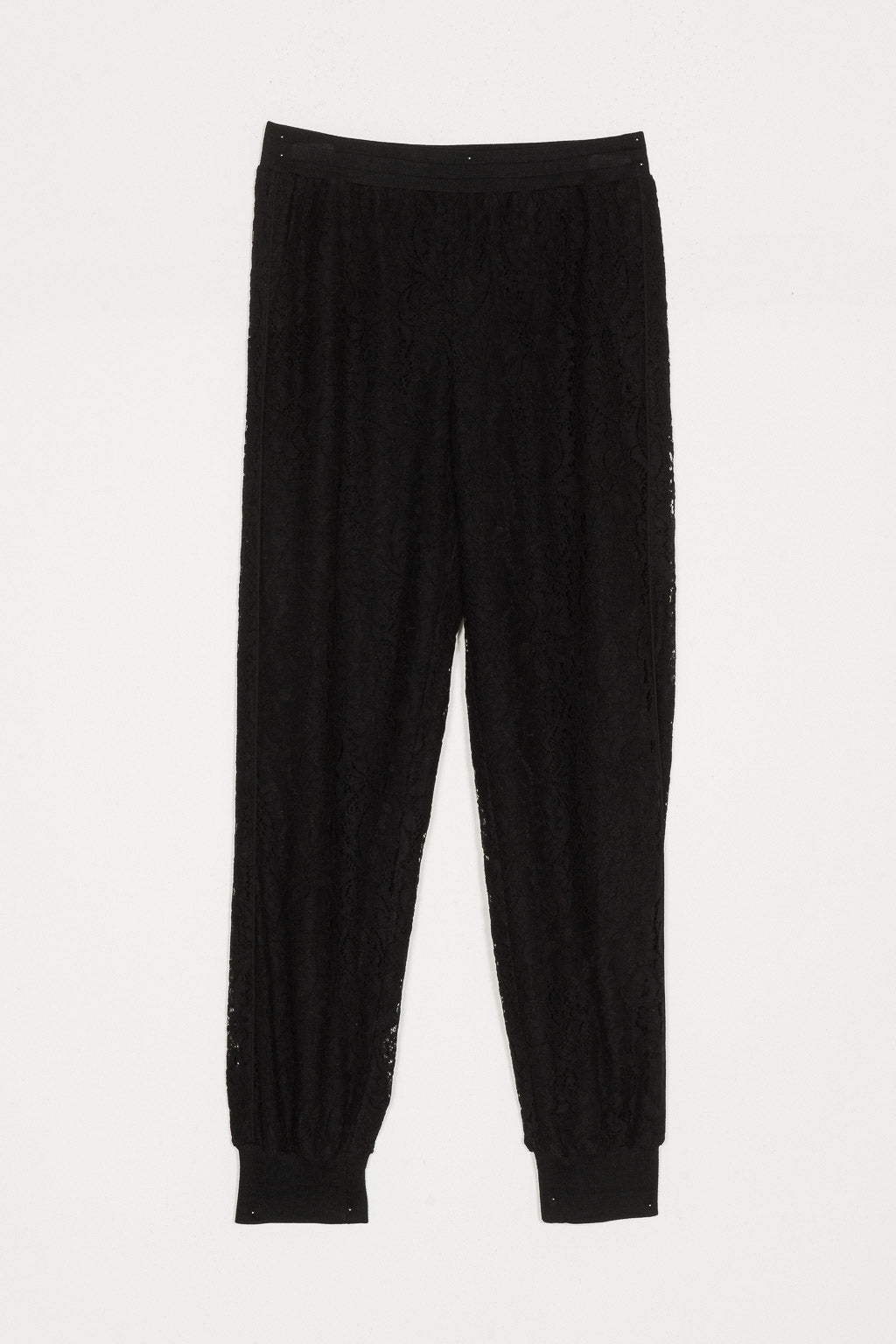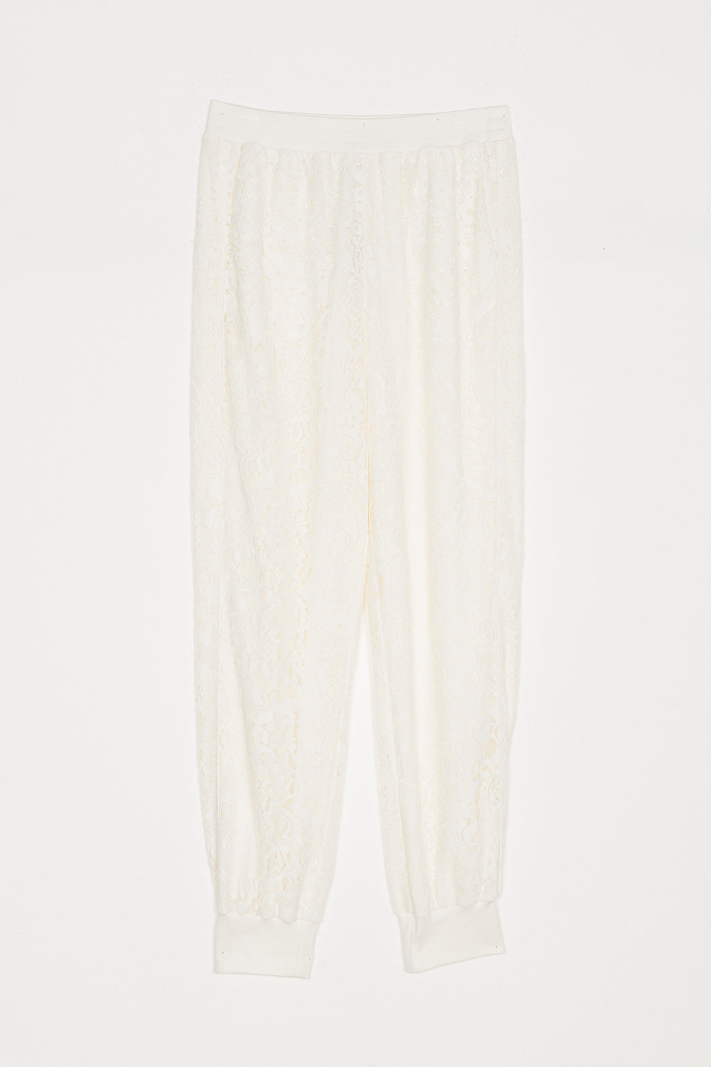 Pantaloni in pizzo con fianchi rifiniti da piping in tono. Hanno elastico in vita, tasche alla francese ai fianchi, fondo a costine, fodera in cotone stretch, placchetta logo a cuore sul retro, linea joggers.