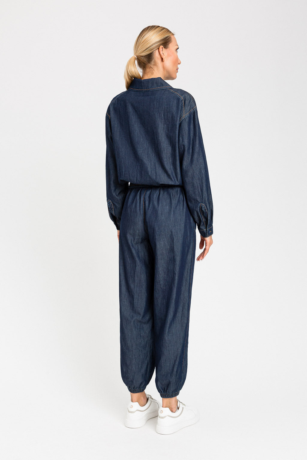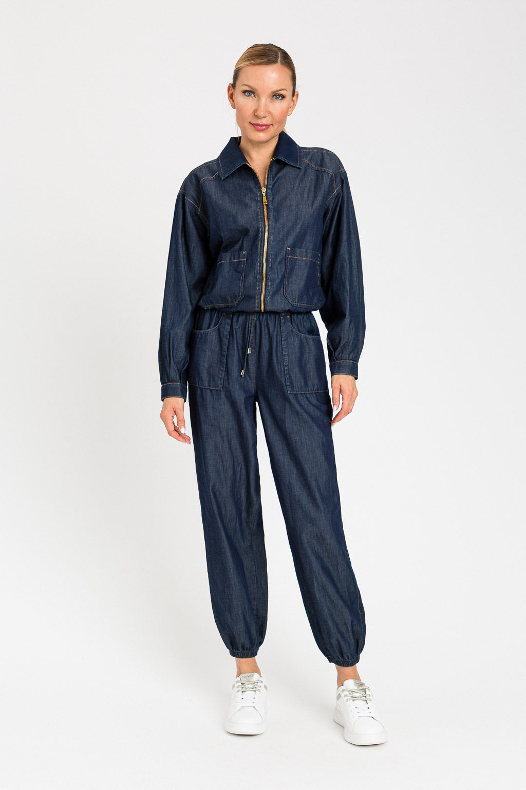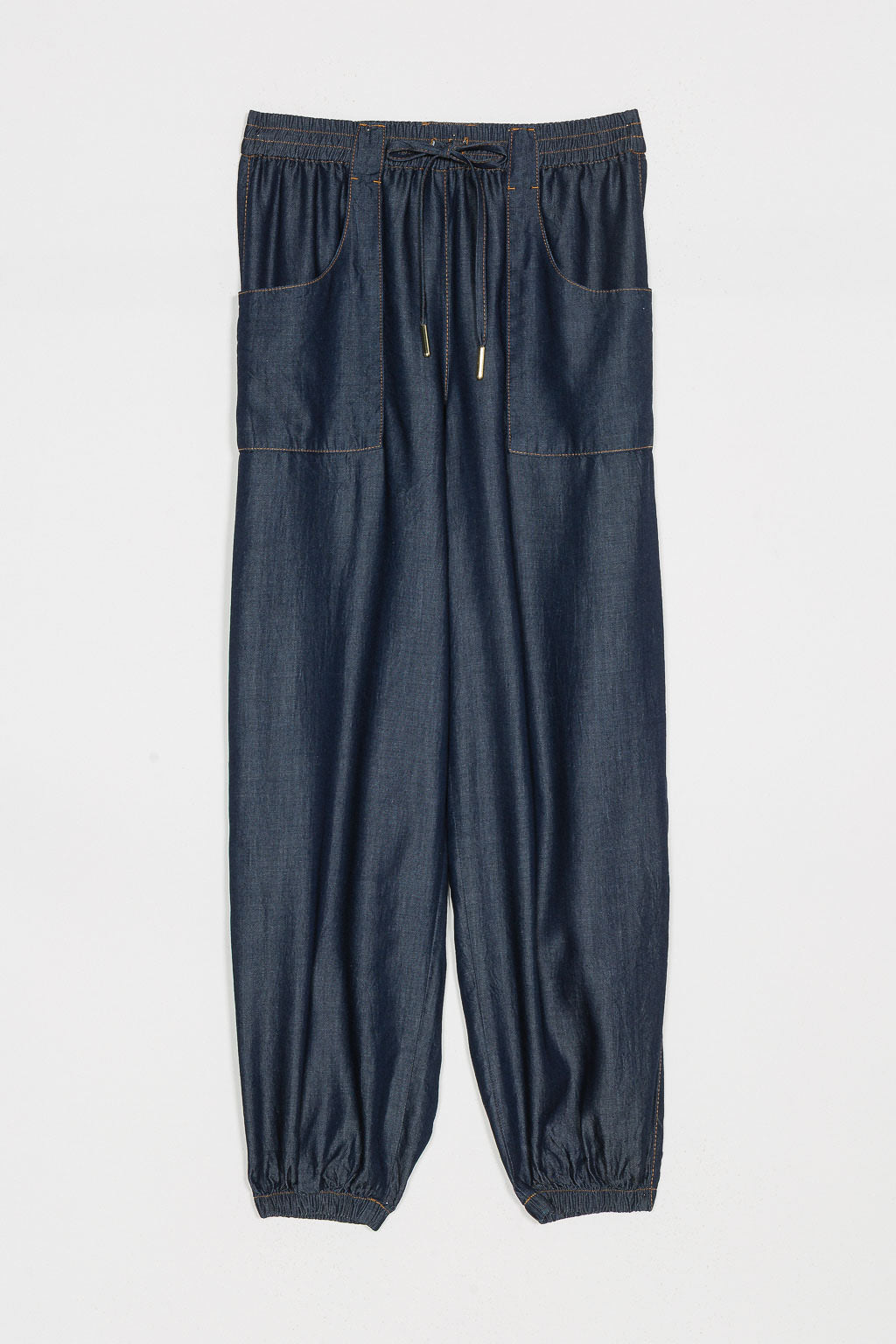 Pantaloni in chambray con tasche laterali a toppa davanti che creano un maxi passante in vita. Hanno elastico con coulisse décor e terminali in metallo, elastico interno al fondo, cuciture ribattute con filo color tabacco, logo a cuore in metallo sul retro, linea joggers.