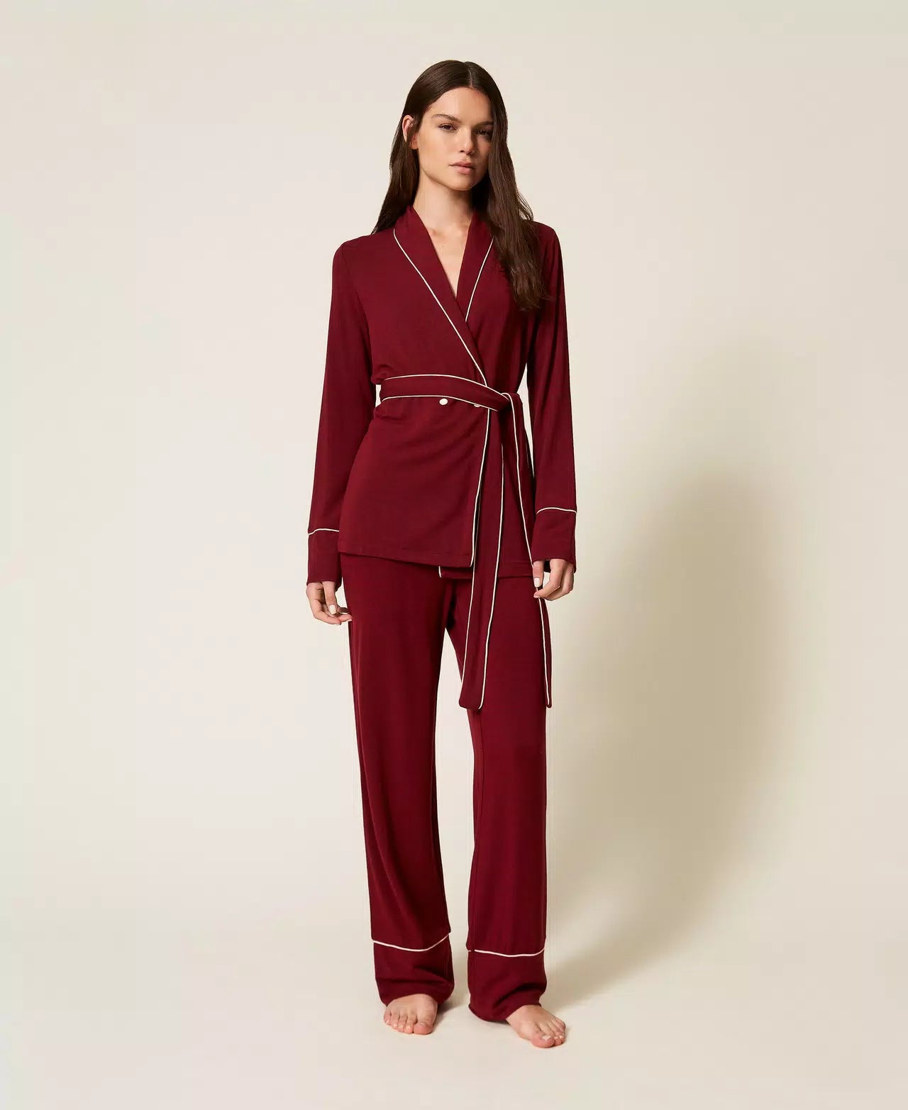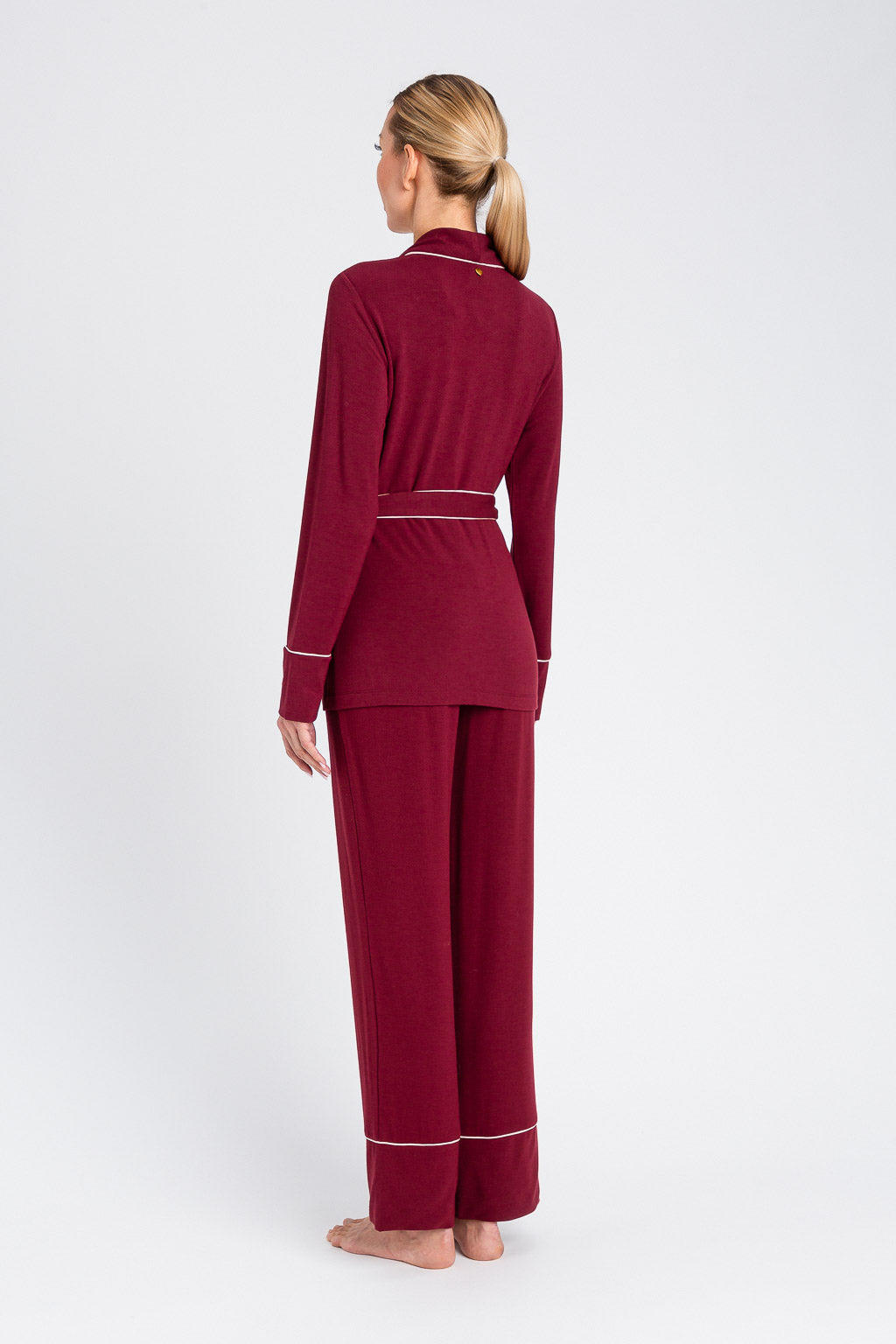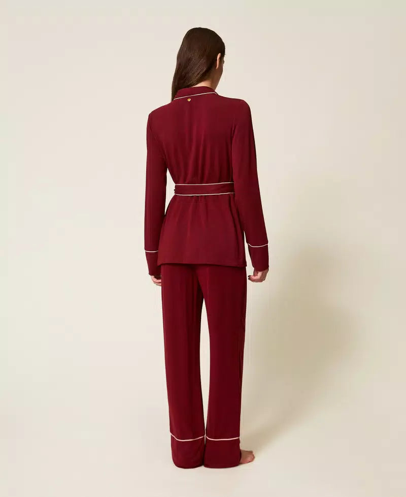 Pigiama a uomo in misto modal con dettagli rifiniti da piping a contrasto. È composto da casacca doppiopetto con revers, maniche lunghe, chiusura con bottoni ricoperti e controbottone interno, placchetta logo a cuore sul retro. I pantaloni sono ampi e hanno l’elastico inserito in vita.