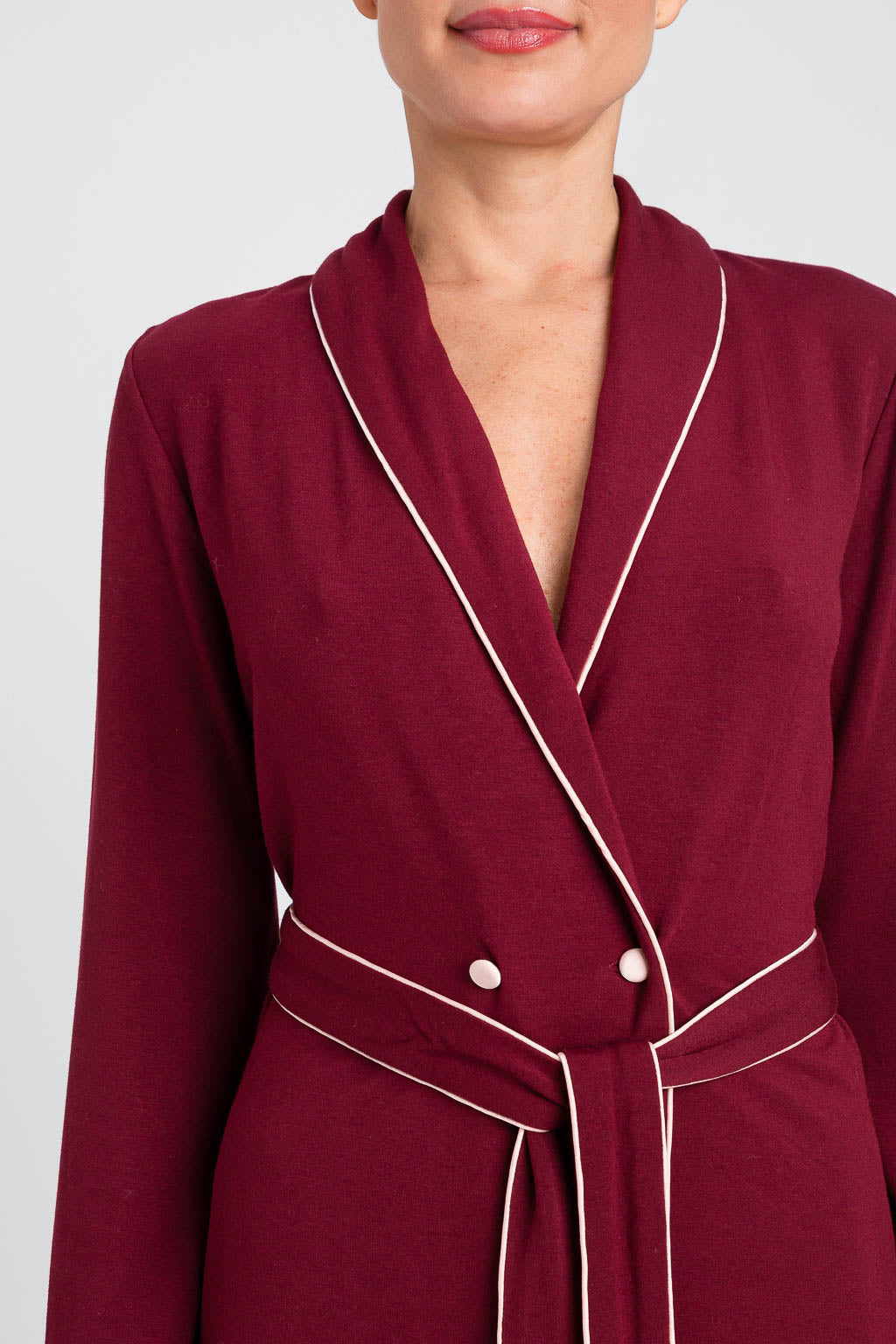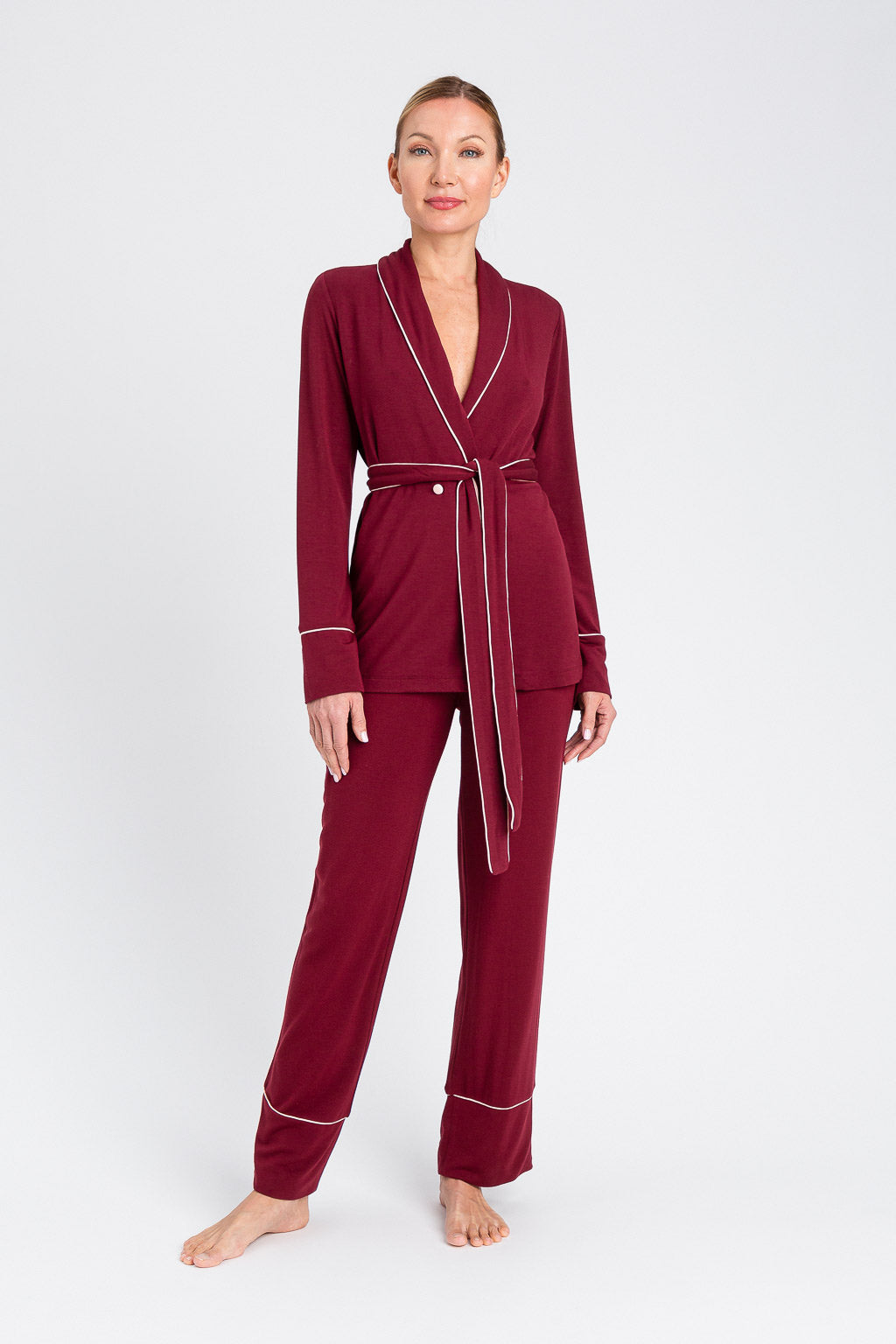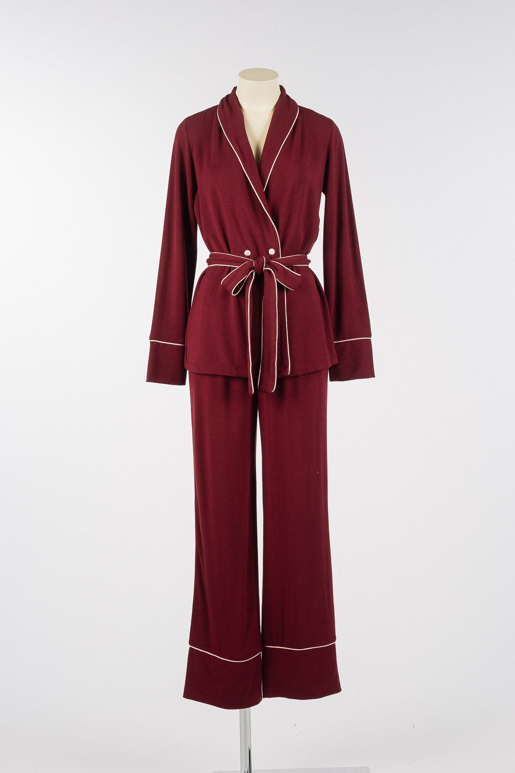 Pigiama a uomo in misto modal con dettagli rifiniti da piping a contrasto. È composto da casacca doppiopetto con revers, maniche lunghe, chiusura con bottoni ricoperti e controbottone interno, placchetta logo a cuore sul retro. I pantaloni sono ampi e hanno l’elastico inserito in vita.