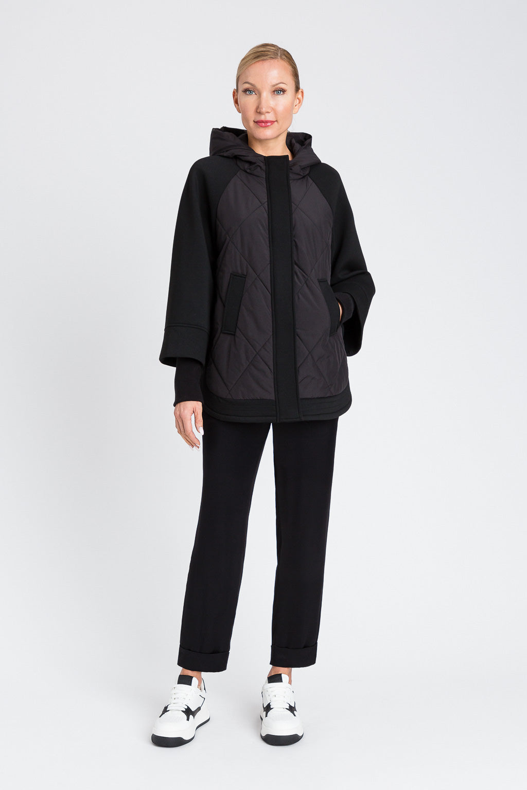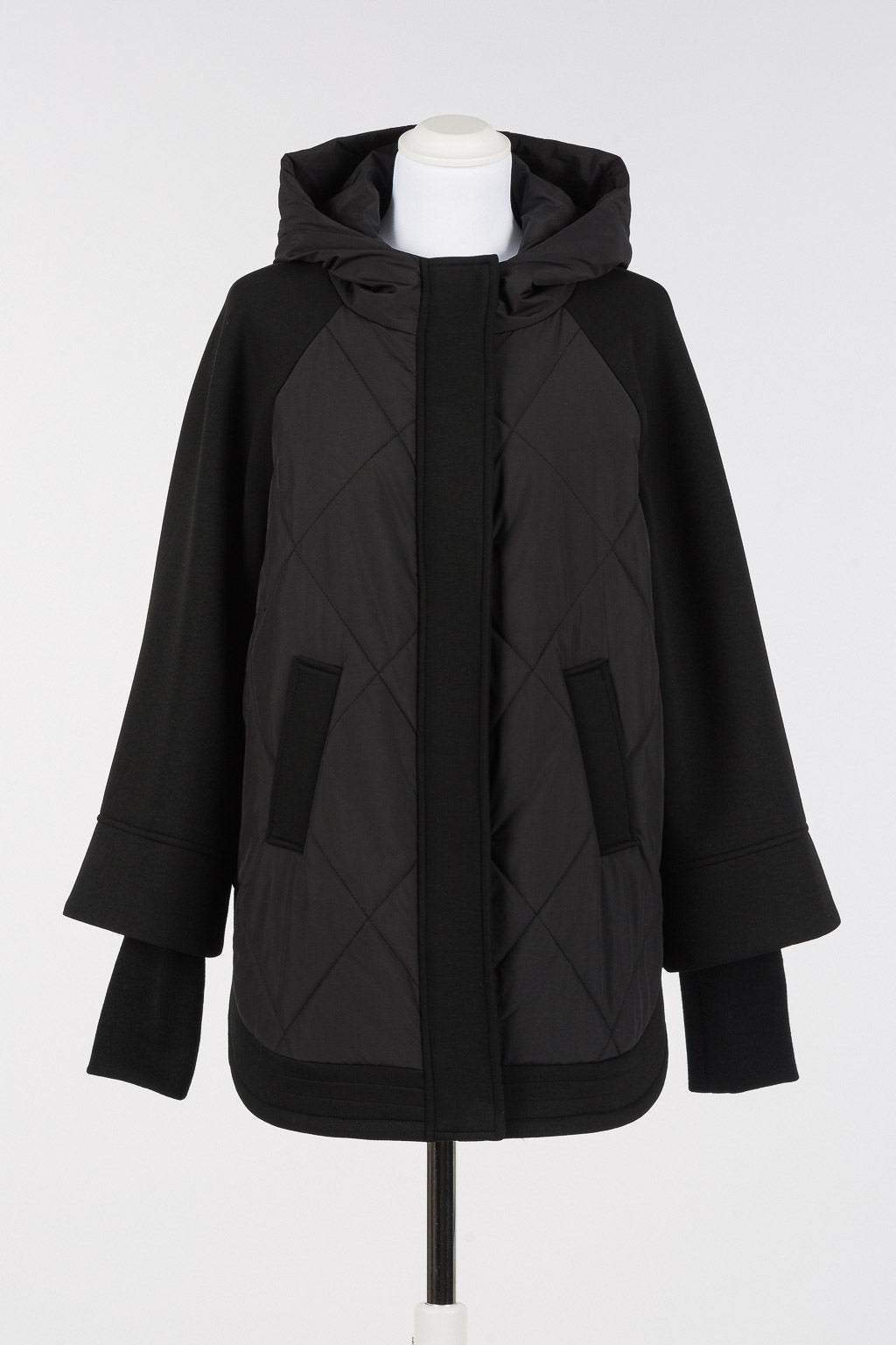 Caban in tessuto scuba e nylon trapuntato con cappuccio. Ha maniche lunghe raglan con polso largo e polsino antivento in costina, chiusura con zip in metallo coperta da patta con bottoni automatici ricoperti, tasche a filetto, placchetta logo in metallo sul cappuccio, linea leggermente svasata.