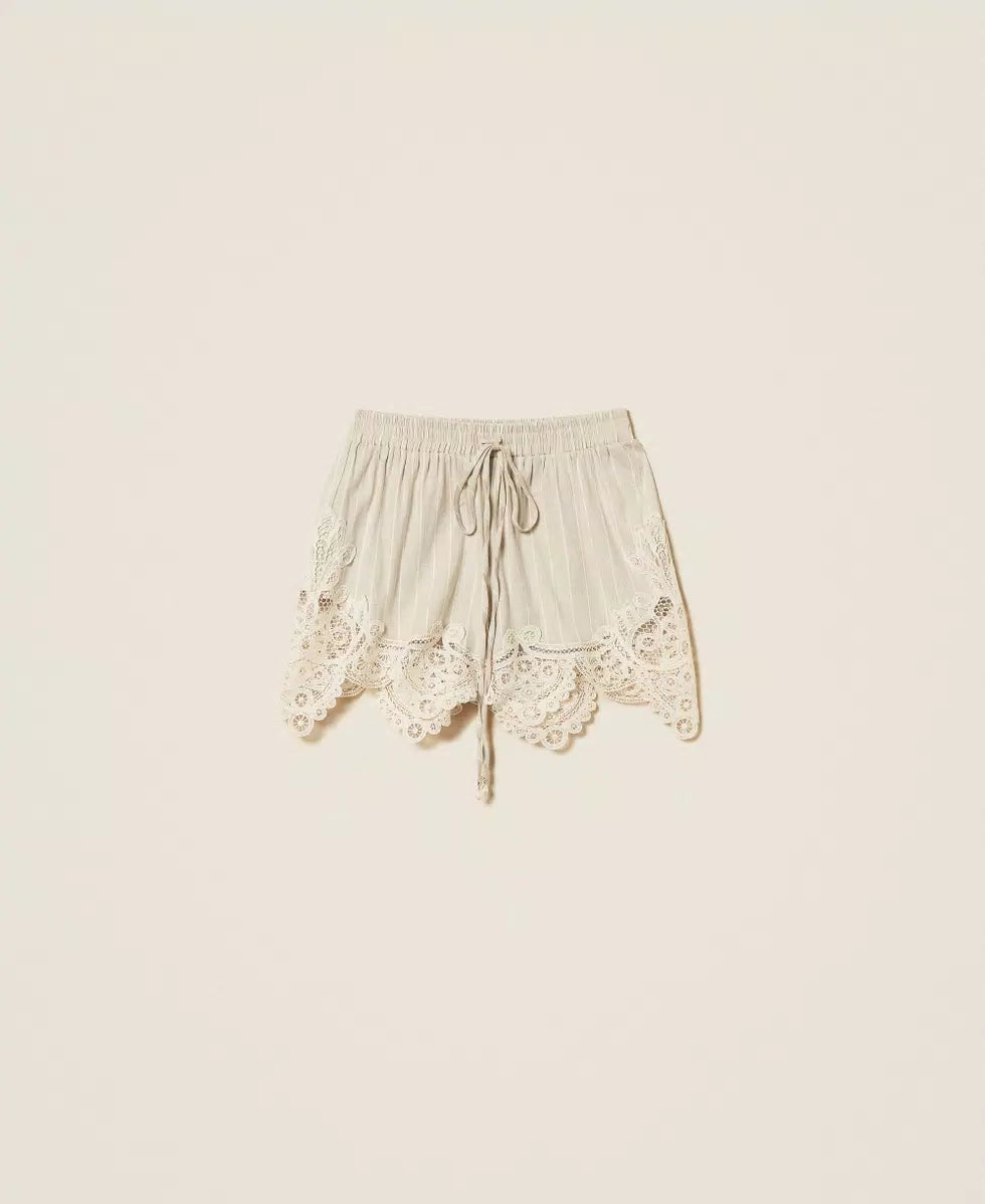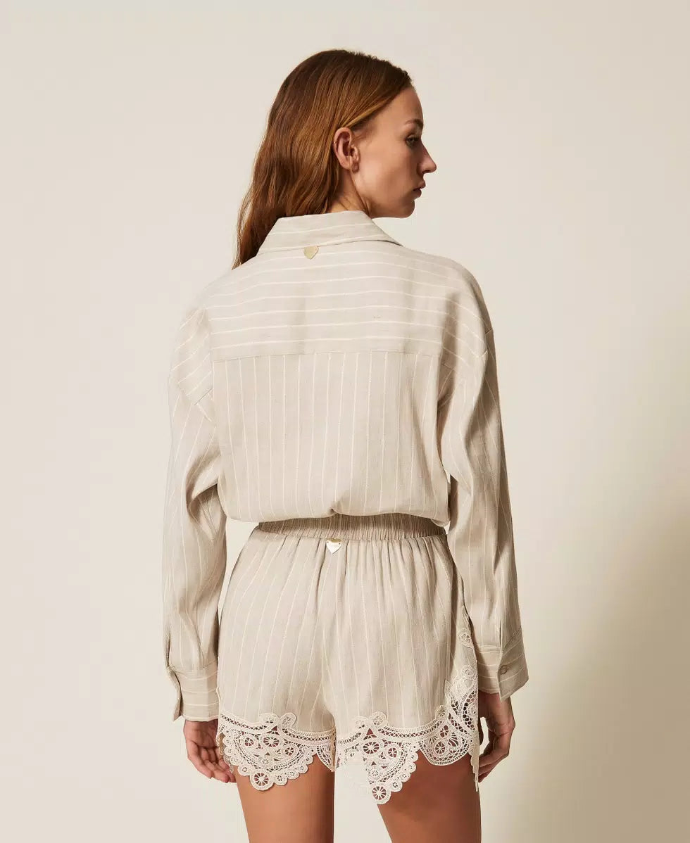 Shorts in misto lino jacquard a motivo righe con lurex dorato e applicazione di macramè smerlato in trasparenza al fondo. Ha elastico in vita e coulisse con terminali a perla, logo a cuore in metallo sul retro, linea morbida.