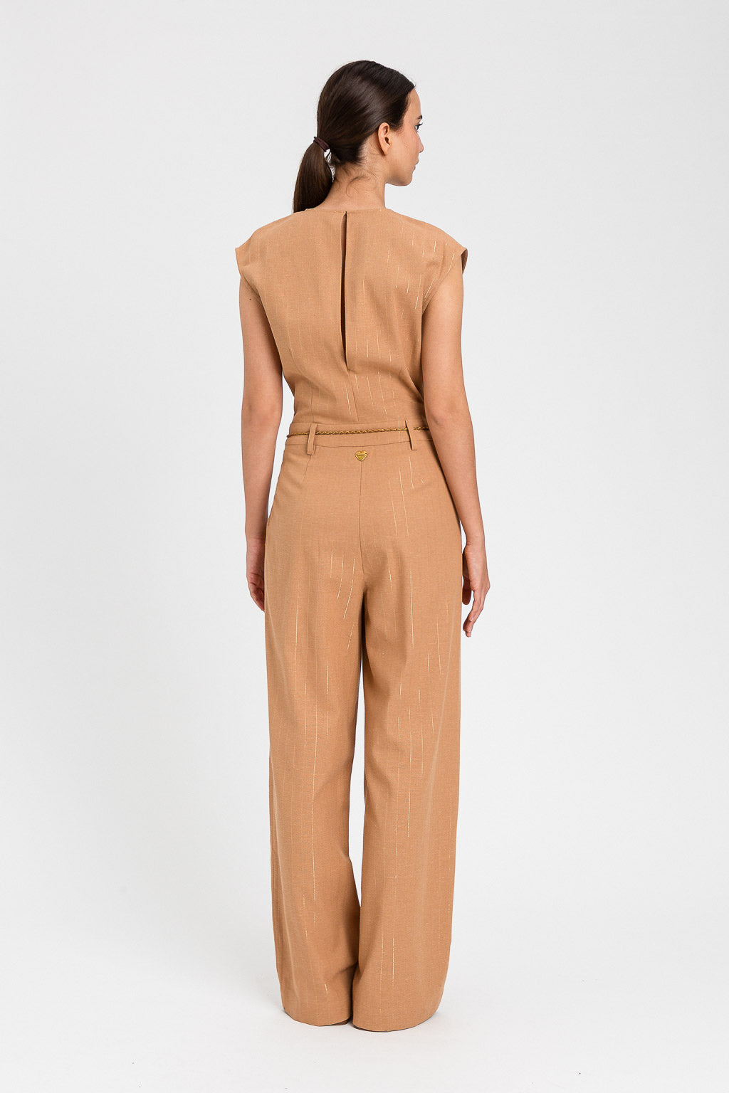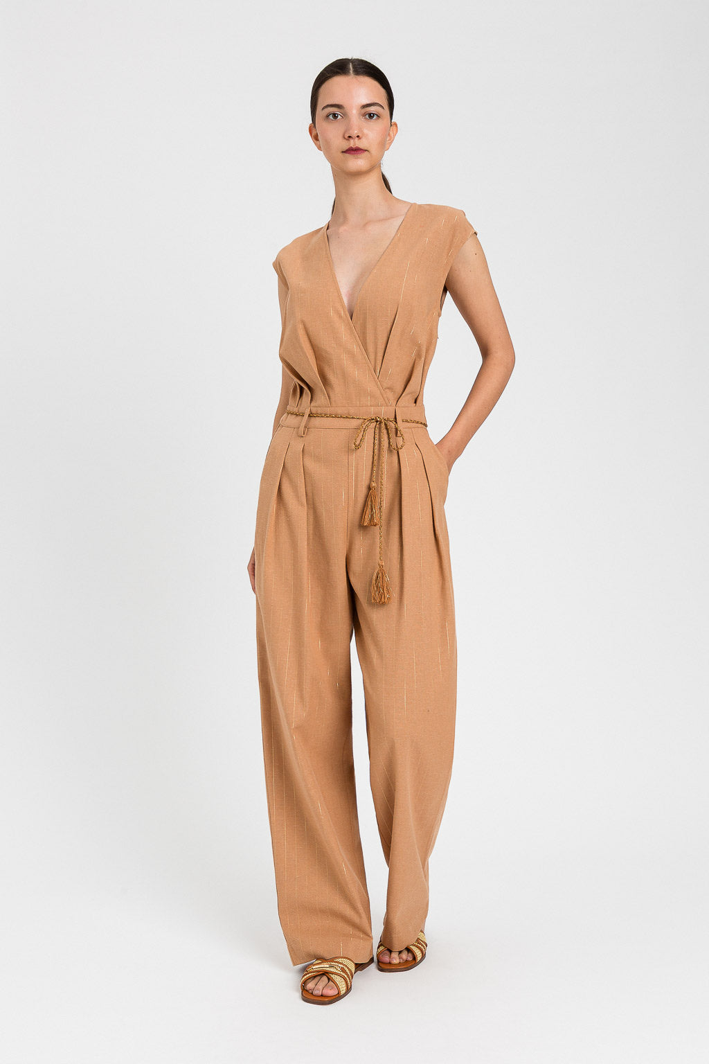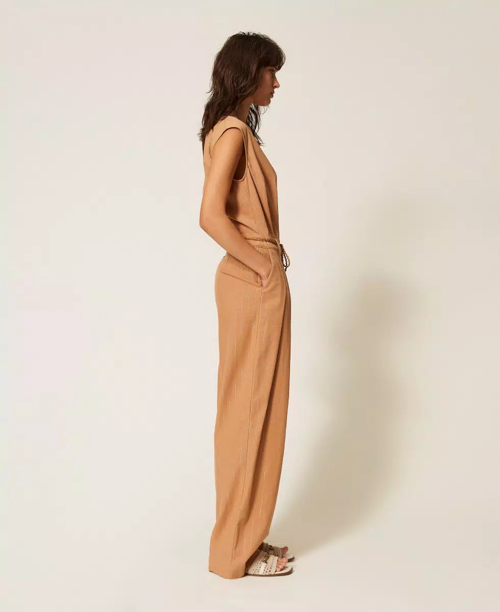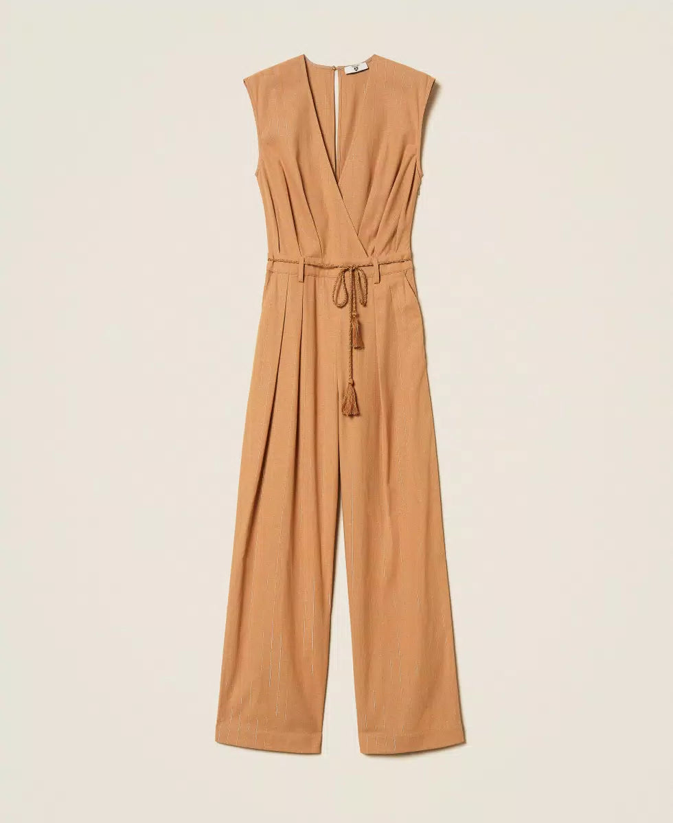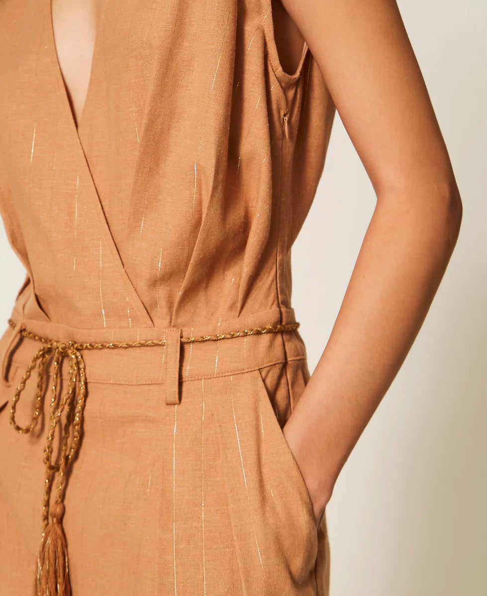 Tuta in misto cotone con righe gessate in lurex color oro. Ha scollo a V con incrocio, pieghe in vita, chiusura con bottone sul retro, zip invisibile, tasche alla francese ai fianchi, logo a cuore in metallo sul retro, linea fitted e morbida. Cintura in coordinato con filo d’oro intrecciato e terminali a nappa con lurex.